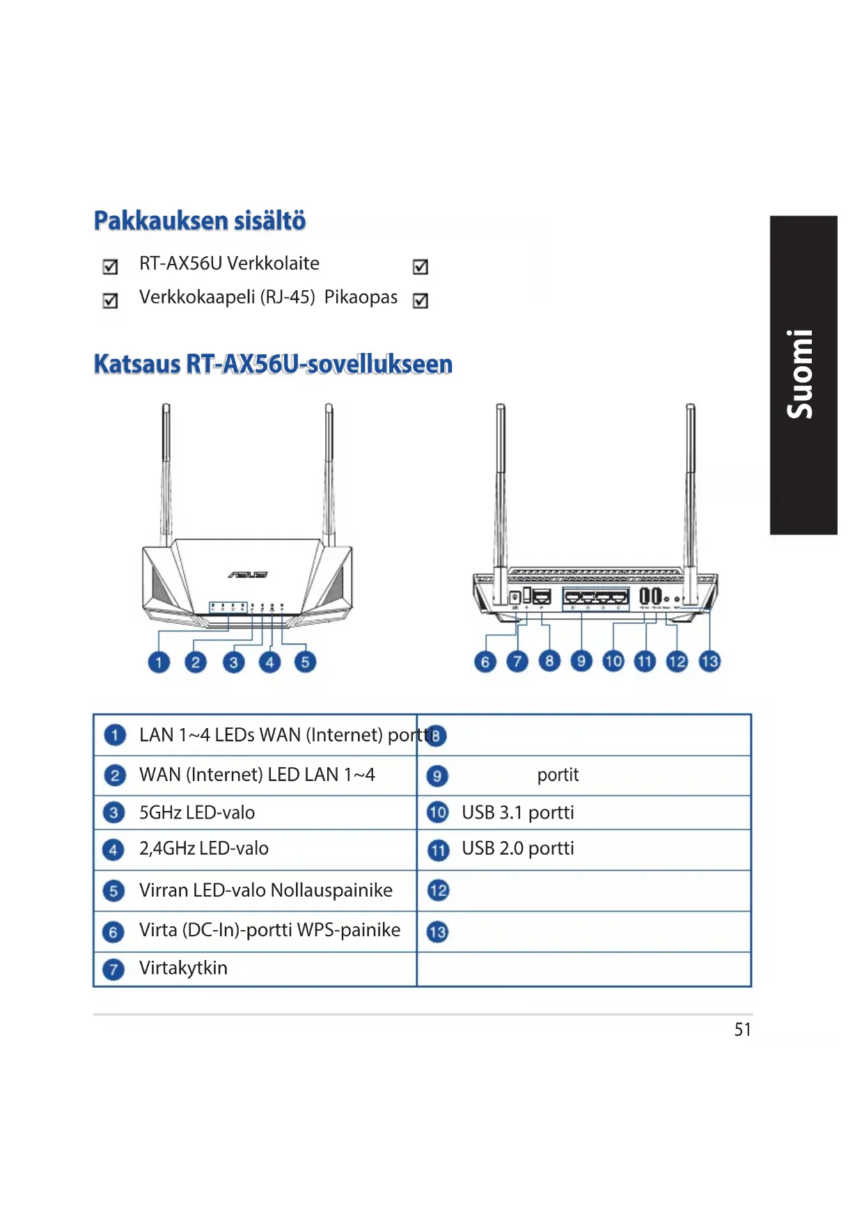 - Vouspouvezconsulterlemanueldel'utilisateurenligneàl'adressesuivante: https://www.asus.com/support51 Suomi Katsaus RT-AX56U-sovellukseen Pakkauksen sisältö RT-AX56U Verkkolaite Verkkokaapeli (RJ-45) Pikaopas LAN 1~4 LEDs WAN (Internet) portti WAN (Internet) LED LAN 1~4 portit 5GHz LED-valo USB 3.1 portti 2,4GHz LED-valo USB 2.0 portti Virran LED-valo Nollauspainike Virta (DC-In)-portti WPS-painike Virtakytkin52 Suomi Reitittimen sijoittaminen Varmistaaksesi parhaan signaalin lähetyksen langattoman reitittimen ja siihen liitettyjen verkkolaitteiden välillä, tarkista, että: