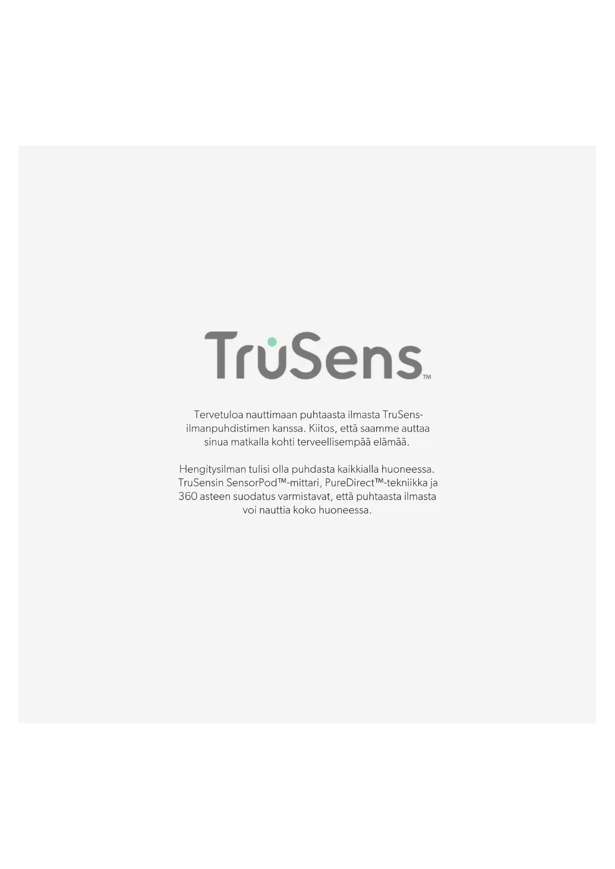 :n kokoiseen huoneeseen.146 OHJAUSPANEELI Tuulettimen nopeusasetukset Valitse tuulettimen nopeus tai AUTO-tila. AUTO-tilassa puhdistin säätää tuulettimen nopeutta automaattisesti SensorPod-mittarin ilmanlaatulukemien perusteella. Ajastintila Puhdistin sammuu automaattisesti 2, 4, 8 tai 12 tunnin kuluttua. Voit peruuttaa tämän ajastuksen painamalla painiketta, kunnes ajastinaikaa ei näy. UV-tila Puhdistimen suodatinkammion UV-C-lamppu on päällä, kun symboli on valkoinen. Symboli palaa punaisena, kun UV-C-lamppu on vaihdettava uuteen. Suodattimien ja UV-lampun merkkivalojen nollaus ”HEPA”- ”Carbon” ja ”UV”-merkkivalot palavat punaisina, kun ne on aika vaihtaa uusiin. Kun yksi merkkivaloista palaa, sen voi nollata pitämällä Reset (nollaus) -painiketta painettuna kolmen sekunnin ajan. Kun vähintään kaksi merkkivaloa palaa, valitse ensin merkkivalo napauttamalla Reset (nollaus) -painiketta (valittu merkkivalo vilkkuu), ja nollaa sitten merkkivalo pitämällä painiketta painettuna kolmen sekunnin ajan. Yötila Näytön valaistus sammuu helpottamaan nukkumista, mutta puhdistimen toiminta jatkuu. Voit palauttaa näytön ominaisuudet näkyviin painamalla painiketta uudelleen. Virtapainike (AUTO-tila on käytettävissä vain, kun puhdistin on yhdistetty SensorPod-mittariin ja vastaanottaa sen signaalia.) (Katso ohjeet sivulta 151). (Katso vaihto-ohjeet sivuilta 149–151. Nollaa merkkivalot yllä olevien ohjeiden mukaisesti suodattimen vaihtamisen jälkeen.)147 ILMANLAATUNÄYTTÖ Reaaliaikainen mittaus Ainutlaatuinen SensorPod™-mittari arvioi ilmanlaatua mittaamalla sekä pienten (PM2,5) että suurempien (PM10) hiukkasten määrää. Se laskee kokonaisilmanlaadun käyttämällä ainutlaatuista algoritmiamme, joka reagoi todellisiin epäpuhtauksiin, mutta ei ylireagoi esimerkiksi jonkun tullessa huoneeseen tai istahtaessa sohvalle. Valaistu ja värikoodattu näyttö ilmoittaa, onko ilmanlaatu hyvä, kohtalainen vai huono, ja numeroarvo kertoo siitä tarkemmin. AUTO-tilassa puhdistin säätää tuulettimen nopeutta automaattisesti näiden ilmanlaatulukemien perusteella. TruSens käyttää Yhdysvaltain ympäristönsuojeluviraston (EPA) ilmanlaatuindeksiä (1–500). HYVÄ SININEN | 0 - 50 KOHTALAINEN KELTAINEN | 50 - 100 HUONO PUNAINEN | 100 - 500148 Ilman tulo 360° Ilma vaihtuu kaksi kertaa tunnissa 35 m² Ilman tuottotapa PureDirect