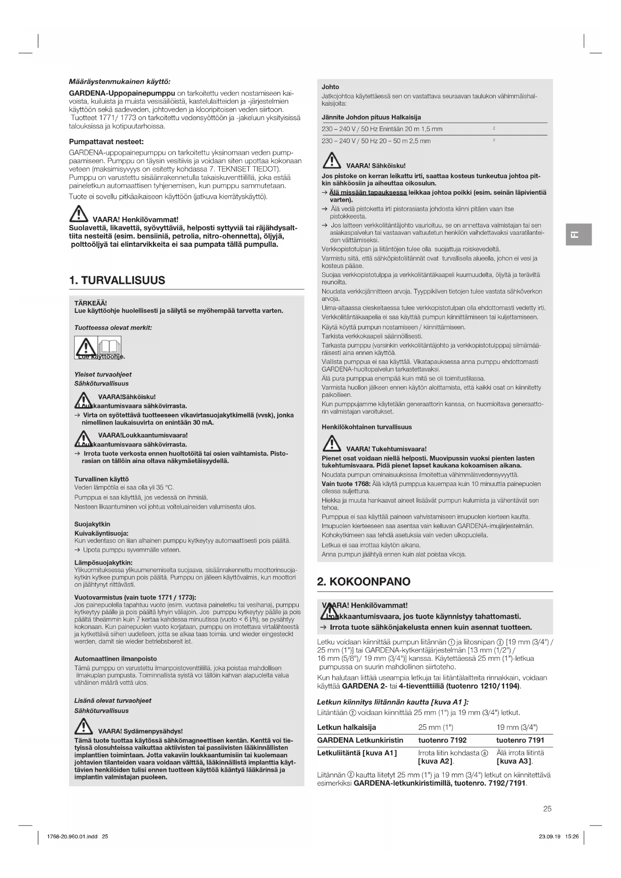 kautta liitetyt 25 mm (1") ja 19 mm (3/4") letkut on kiinnitettävä esimerkiksi GARDENA-letkunkiristimillä, tuotenro. 7192 / 7191. Määräystenmukainen käyttö: GARDENA-Uppopainepumppu on tarkoitettu veden nostamiseen kai- voista, kuiluista ja muista vesisäiliöistä, kastelulaitteiden ja -järjestelmien käyttöön sekä sadeveden, johtoveden ja klooripitoisen veden siirtoon. Tuotteet 1771 / 1773 on tarkoitettu vedensyöttöön ja -jakeluun yksityisissä talouksissa ja kotipuutarhoissa. Pumpattavat nesteet: GARDENA-uppopainepumppu on tarkoitettu yksinomaan veden pump- paamiseen. Pumppu on täysin vesitiivis ja voidaan siten upottaa kokonaan veteen (maksimisyvyys on esitetty kohdassa 7. TEKNISET TIEDOT). Pumppu on varustettu sisäänrakennetulla takaiskuventtiilillä, joka estää paineletkun automaattisen tyhjenemisen, kun pumppu sammutetaan. Tuote ei sovellu pitkäaikaiseen käyttöön (jatkuva kierrätyskäyttö).