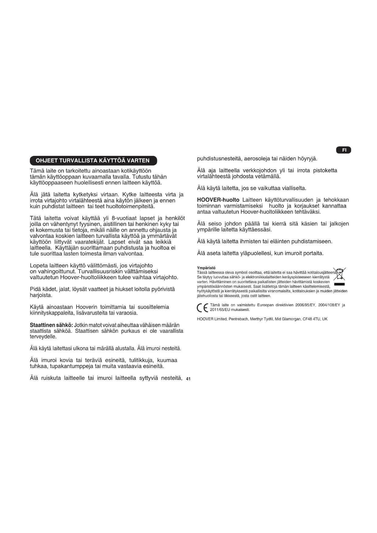 Tämä laite on tarkoitettu ainoastaan kotikäyttöön tämän käyttöoppaan kuvaamalla tavalla. Tutustu tähän käyttöoppaaseen huolellisesti ennen laitteen käyttöä. Älä jätä laitetta kytketyksi virtaan. Kytke laitteesta virta ja irrota virtajohto virtalähteestä aina käytön jälkeen ja ennen kuin puhdistat laitteen tai teet huoltotoimenpiteitä. Tätä laitetta voivat käyttää yli 8-vuotiaat lapset ja henkilöt joilla on vähentynyt fyysinen, aistillinen tai henkinen kyky tai ei kokemusta tai tietoja, mikäli näille on annettu ohjausta ja valvontaa koskien laitteen turvallista käyttöä ja ymmärtävät käyttöön liittyvät vaaratekijät. Lapset eivät saa leikkiä laitteella. Käyttäjän suorittamaan puhdistusta ja huoltoa ei tule suorittaa lasten toimesta ilman valvontaa. Lopeta laitteen käyttö välittömästi, jos virtajohto on vahingoittunut. Turvallisuusriskin välttämiseksi valtuutetun Hoover-huoltoliikkeen tulee vaihtaa virtajohto. Pidä kädet, jalat, löysät vaatteet ja hiukset loitolla pyörivistä harjoista. Käytä ainoastaan Hooverin toimittamia tai suosittelemia kiinnityskappaleita, lisävarusteita tai varaosia. Staattinen sähkö: Jotkin matot voivat aiheuttaa vähäisen määrän staattista sähköä. Staattisen sähkön purkaus ei ole vaarallista terveydelle. Älä käytä laitettasi ulkona tai märällä alustalla. Älä imuroi nesteitä. Älä imuroi kovia tai teräviä esineitä, tulitikkuja, kuumaa tuhkaa, tupakantumppeja tai muita vastaavia esineitä. Älä ruiskuta laitteelle tai imuroi laitteella syttyviä nesteitä, puhdistusnesteitä, aerosoleja tai näiden höyryjä. Älä aja laitteella verkkojohdon yli tai irrota pistoketta virtalähteestä johdosta vetämällä. Älä käytä laitetta, jos se vaikuttaa vialliselta. HOOVER-huolto Laitteen käyttöturvallisuuden ja tehokkaan toiminnan varmistamiseksi huolto ja korjaukset kannattaa antaa valtuutetun Hoover-huoltoliikkeen tehtäväksi. Älä seiso johdon päällä tai kierrä sitä käsien tai jalkojen ympärille laitetta käyttäessäsi. Älä käytä laitetta ihmisten tai eläinten puhdistamiseen. Älä aseta laitetta yläpuolellesi, kun imuroit portaita. Ympäristö Tässä laitteessa oleva symboli osoittaa, että laitetta ei saa hävittää kotitalousjätteenä. Se täytyy luovuttaa sähkö- ja elektroniikkalaitteiden keräyspisteeseen kierrätystä varten. Hävittäminen on suoritettava paikallisten jätteiden hävittämistä koskevien ympäristösäännösten mukaisesti. Saat lisätietoja tämän laitteen käsittelemisestä, hyötykäytöstä ja kierrätyksestä paikallisilta viranomaisilta, kotitalouksien ja muiden jätteiden jätehuollosta tai liikkeestä, josta ostit laitteen. Tämä laite on valmistettu Euroopan direktiivien 2006/95/EY, 2004/108/EY ja 2011/65/EU mukaisesti. HOOVER Limited, Pentrebach, Merthyr Tydl, Mid Glamorgan, CF48 4TU, UK FI42 IMURIN OSAT A. Imurin runko B. Pölykasetti C. Pölykasetin kahva D. Käynnistyspainike E. Johdon kelauspainike F. Pölykasetin vapautuspainike G. Pölykasetin kannen salpa H. Suodatinpakkaus