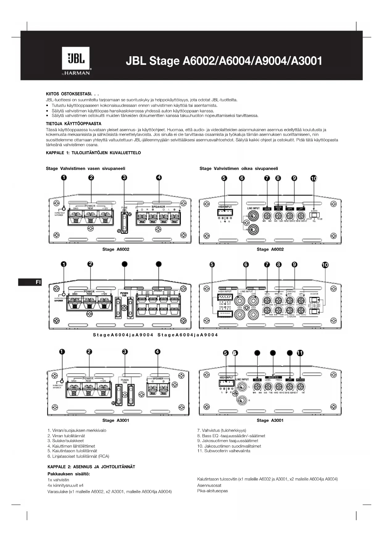 Tässä käyttöoppaassa kuvataan yleiset asennus- ja käyttöohjeet. Huomaa, että audio- ja videolaitteiden asianmukainen asennus edellyttää koulutusta ja kokemusta mekaanisista ja sähköisistä menettelytavoista. Jos sinulla ei ole tarvittavaa osaamista ja työkaluja tämän asennuksen suorittamiseen, niin suosittelemme ottamaan yhteyttä valtuutettuun JBL-jälleenmyyjään selvittääksesi asennusvaihtoehdot. Säilytä kaikki ohjeet ja ostokuitit. Pidä tätä käyttöopasta tärkeänä vahvistimen osana.KAPPALE 1: TULOLIITÄNTÖJEN KUVALUETTELOStage Vahvistimen vasen sivupaneeliStage A6002StageA6004jaA9004 StageA6004jaA9004Stage A3001Stage A6002Stage A30011. Virran/suojauksen merkkivalo2. Virran tuloliitännät3. Sulake/sulakkeet4. Kaiuttimen lähtöliittimet5. Kaiutintason tuloliitännät6. Linjatasoiset tuloliitännät (RCA)7. Vahvistus (tuloherkkyys)8. Bass EQ -taajuussäädin/-säätimet9. Jakosuotimen taajuussäätimet10. Jakosuotimen suodinvalitsimet11. Subwooferin vaihevalintaStage Vahvistimen oikea sivupaneeliKAPPALE 2: ASENNUS JA JOHTOLIITÄNNÄTPakkauksen sisältö:1x vahvistin4x kiinnitysruuvit x4 Varasulake (x1 malleille A6002, x2 A3001, malleille A6004ja A9004) Kaiutintason tulosovitin (x1 malleille A6002 ja A3001, x2 malleille A6004ja A9004) AsennusosatPika-aloitusopas