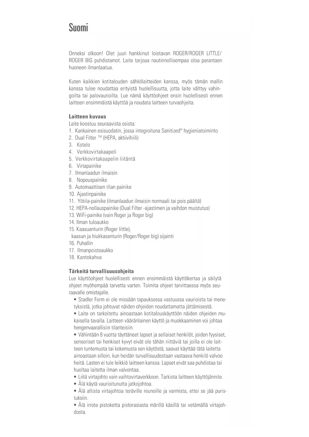 /h (Clean Air Delivery Rate iht. AHAM) Mål 420 x 520 x 340 mm (bredde x højde x dybde) Vægt 10.5 kg Støjniveau 28–58 dB(A) I overensstemmelse med EU godkendelse CE / WEEE / RoHS / EAC Dette apparat indeholder en radiomodul fra Stadler Form Aktiengesellschaft type WBR3. Det arbejder på ISM-båndet i området 2.412 – 2.484 GHz med en maksimal effekt på 56.2 mW og 89.1 mW EIRP. Der tages forbehold for tekniske ændringerOnneksi olkoon! Olet juuri hankkinut loistavan ROGER/ROGER LITTLE/ ROGER BIG puhdistamot. Laite tarjoaa nautinnollisempaa oloa parantaen huoneen ilmanlaatua. Kuten kaikkien kotitalouden sähkölaitteiden kanssa, myös tämän mallin kanssa tulee noudattaa erityistä huolellisuutta, jotta laite välttyy vahin- goilta tai palovaurioilta. Lue nämä käyttöohjeet ensin huolellisesti ennen laitteen ensimmäistä käyttöä ja noudata laitteen turvaohjeita. Laitteen kuvaus Laite koostuu seuraavista osista: