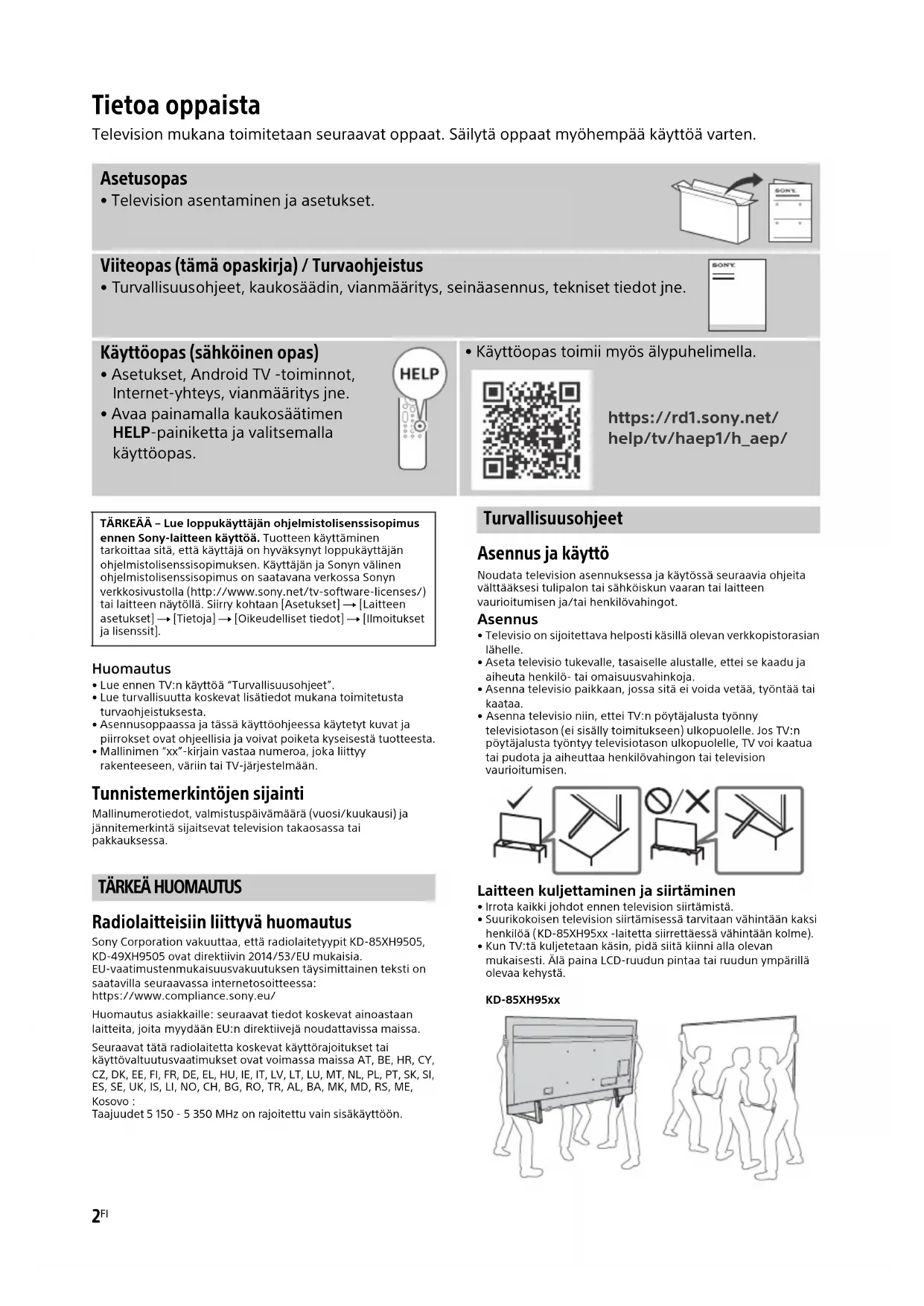 Radiolaitteisiin liittyvä huomautus Sony Corporation vakuuttaa, että radiolaitetyypit KD-85XH9505, KD-49XH9505 ovat direktiivin 2014/53/EU mukaisia. EU-vaatimustenmukaisuusvakuutuksen täysimittainen teksti on saatavilla seuraavassa internetosoitteessa: https://www.compliance.sony.eu/Huomautus asiakkaille: seuraavat tiedot koskevat ainoastaan laitteita, joita myydään EU:n direktiivejä noudattavissa maissa.Seuraavat tätä radiolaitetta koskevat käyttörajoitukset tai käyttövaltuutusvaatimukset ovat voimassa maissa AT, BE, HR, CY, CZ, DK, EE, FI, FR, DE, EL, HU, IE, IT, LV, LT, LU, MT, NL, PL, PT, SK, SI, ES, SE, UK, IS, LI, NO, CH, BG, RO, TR, AL, BA, MK, MD, RS, ME, Kosovo : Taajuudet 5 150 - 5 350 MHz on rajoitettu vain sisäkäyttöön. Turvallisuusohjeet Asennus ja käyttö Noudata television asennuksessa ja käytössä seuraavia ohjeita välttääksesi tulipalon tai sähköiskun vaaran tai laitteen vaurioitumisen ja/tai henkilövahingot. Asennus