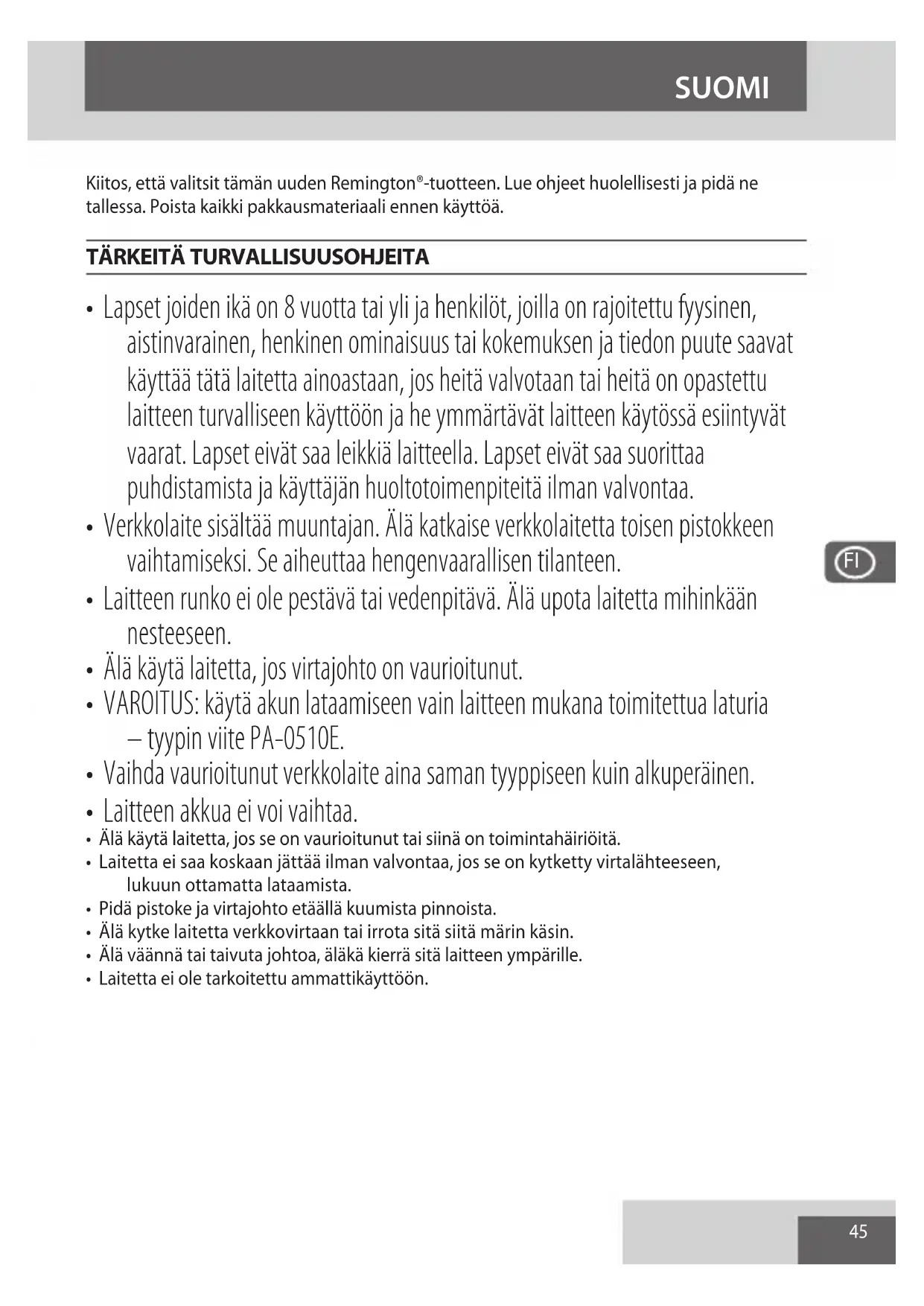 - Lapset joiden ikä on 8 vuotta tai yli ja henkilöt, joilla on rajoitettu fyysinen, aistinvarainen, henkinen ominaisuus tai kokemuksen ja tiedon puute saavat käyttää tätä laitetta ainoastaan, jos heitä valvotaan tai heitä on opastettu laitteen turvalliseen käyttöön ja he ymmärtävät laitteen käytössä esiintyvät vaarat. Lapset eivät saa leikkiä laitteella. Lapset eivät saa suorittaa puhdistamista ja käyttäjän huoltotoimenpiteitä ilman valvontaa.