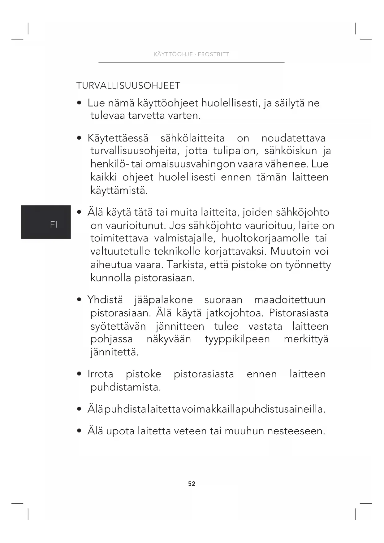 - Älä upota laitetta veteen tai muuhun nesteeseen.53