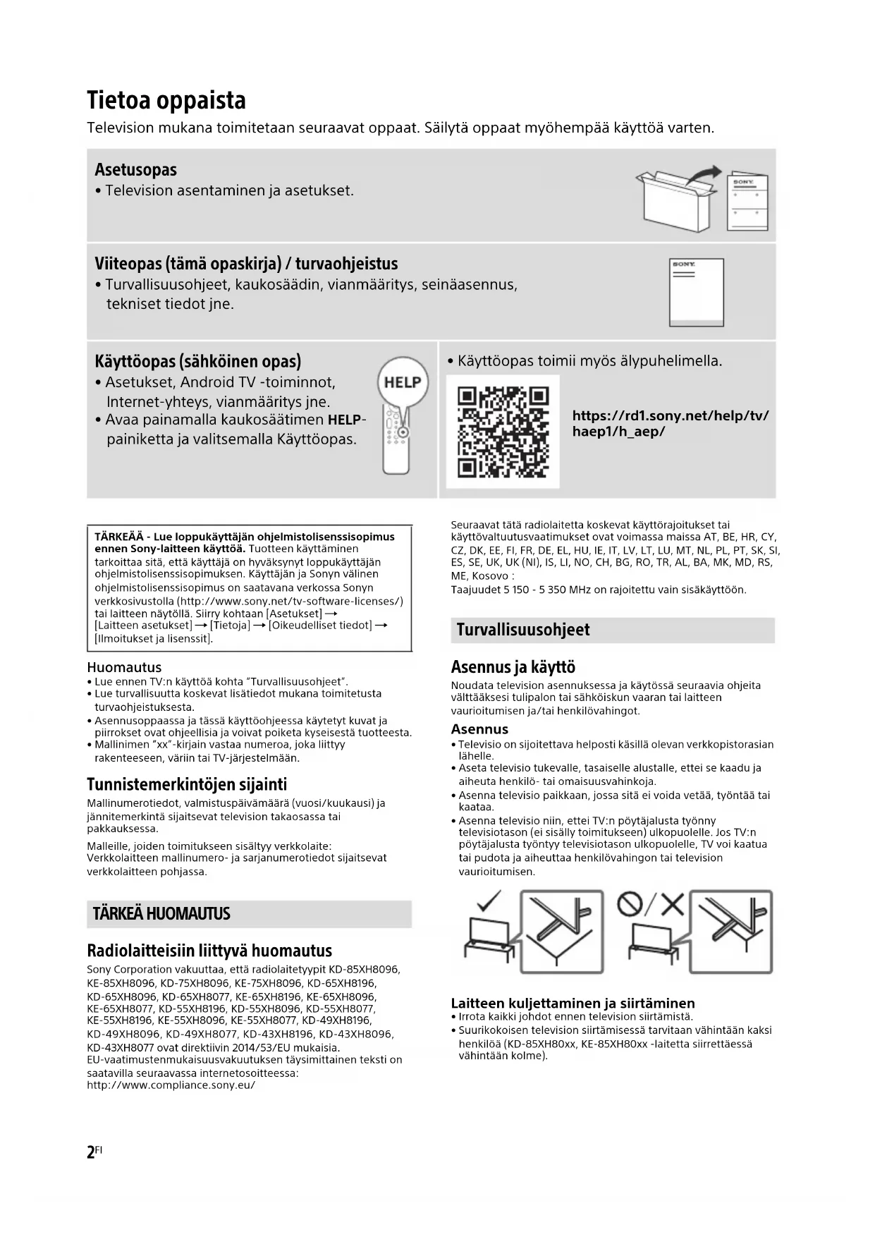 - Mallinimen ”xx”-kirjain vastaa numeroa, joka liittyy rakenteeseen, väriin tai TV-järjestelmään. Tunnistemerkintöjen sijainti Mallinumerotiedot, valmistuspäivämäärä (vuosi/kuukausi) ja jännitemerkintä sijaitsevat television takaosassa tai pakkauksessa. Malleille, joiden toimitukseen sisältyy verkkolaite: Verkkolaitteen mallinumero- ja sarjanumerotiedot sijaitsevat verkkolaitteen pohjassa. Radiolaitteisiin liittyvä huomautus Sony Corporation vakuuttaa, että radiolaitetyypit KD-85XH8096, KE-85XH8096, KD-75XH8096, KE-75XH8096, KD-65XH8196, KD-65XH8096, KD-65XH8077, KE-65XH8196, KE-65XH8096, KE-65XH8077, KD-55XH8196, KD-55XH8096, KD-55XH8077, KE-55XH8196, KE-55XH8096, KE-55XH8077, KD-49XH8196, KD-49XH8096, KD-49XH8077, KD-43XH8196, KD-43XH8096, KD-43XH8077 ovat direktiivin 2014/53/EU mukaisia. EU-vaatimustenmukaisuusvakuutuksen täysimittainen teksti on saatavilla seuraavassa internetosoitteessa: http://www.compliance.sony.eu/ Seuraavat tätä radiolaitetta koskevat käyttörajoitukset tai käyttövaltuutusvaatimukset ovat voimassa maissa AT, BE, HR, CY, CZ, DK, EE, FI, FR, DE, EL, HU, IE, IT, LV, LT, LU, MT, NL, PL, PT, SK, SI, ES, SE, UK, UK (NI), IS, LI, NO, CH, BG, RO, TR, AL, BA, MK, MD, RS, ME, Kosovo : Taajuudet 5 150 - 5 350 MHz on rajoitettu vain sisäkäyttöön. Asennus ja käyttö Noudata television asennuksessa ja käytössä seuraavia ohjeita välttääksesi tulipalon tai sähköiskun vaaran tai laitteen vaurioitumisen ja/tai henkilövahingot. Asennus