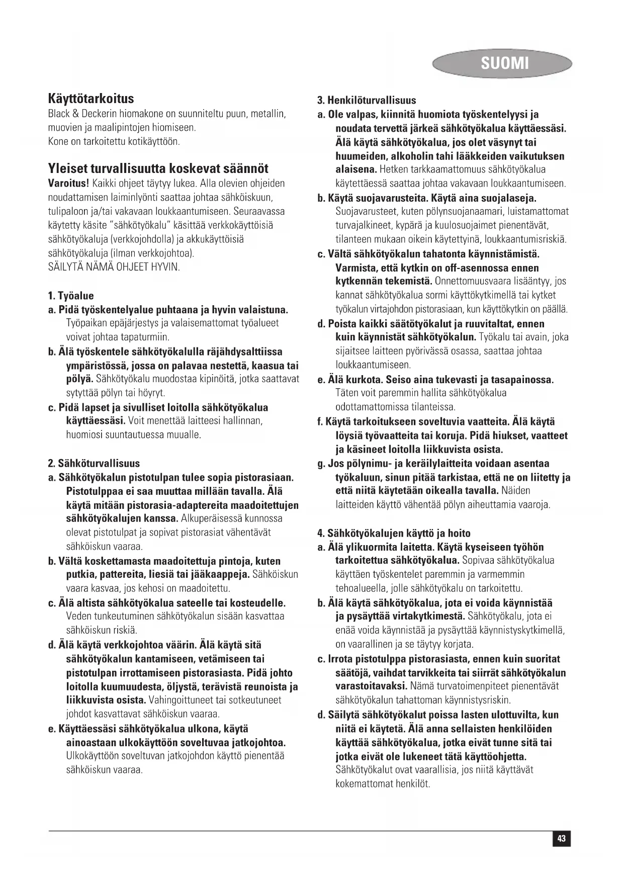 a. Älä ylikuormita laitetta. Käytä kyseiseen työhön tarkoitettua sähkötyökalua. Sopivaa sähkötyökalua käyttäen työskentelet paremmin ja varmemmin tehoalueella, jolle sähkötyökalu on tarkoitettu. b. Älä käytä sähkötyökalua, jota ei voida käynnistää ja pysäyttää virtakytkimestä. Sähkötyökalu, jota ei enää voida käynnistää ja pysäyttää käynnistyskytkimellä, on vaarallinen ja se täytyy korjata. c. Irrota pistotulppa pistorasiasta, ennen kuin suoritat säätöjä, vaihdat tarvikkeita tai siirrät sähkötyökalun varastoitavaksi. Nämä turvatoimenpiteet pienentävät sähkötyökalun tahattoman käynnistysriskin. d. Säilytä sähkötyökalut poissa lasten ulottuvilta, kun niitä ei käytetä. Älä anna sellaisten henkilöiden käyttää sähkötyökalua, jotka eivät tunne sitä tai jotka eivät ole lukeneet tätä käyttöohjetta. Sähkötyökalut ovat vaarallisia, jos niitä käyttävät kokemattomat henkilöt.44 SUOMI e. Hoida sähkötyökalusi huolella. Tarkista, että liikkuvat osat toimivat moitteettomasti, eivätkä ole puristuksessa ja että työkalussa ei ole murtuneita tai vahingoittuneita osia, jotka saattaisivat vaikuttaa haitallisesti sen toimintaan. Korjautattaa mahdolliset viat ennen käyttöönottoa. Moni tapaturma aiheutuu huonosti huolletuista laitteista. f. Pidä leikkausterät terävinä ja puhtaina. Huolellisesti hoidetut leikkaustyökalut, joiden leikkausreunat ovat teräviä, eivät tartu helposti kiinni ja niitä on helpompi hallita. g. Käytä sähkötyökaluja, tarvikkeita, vaihtotyökaluja jne. näiden ohjeiden mukaisesti ja tavalla, joka on tarkoitettu erityisesti kyseiselle sähkötyökalulle. Ota tällöin huomioon työolosuhteet ja suoritettava toimenpide. Sähkötyökalun käyttö muuhun kuin sille määrättyyn käyttöön, saattaa johtaa vaarallisiin tilanteisiin.