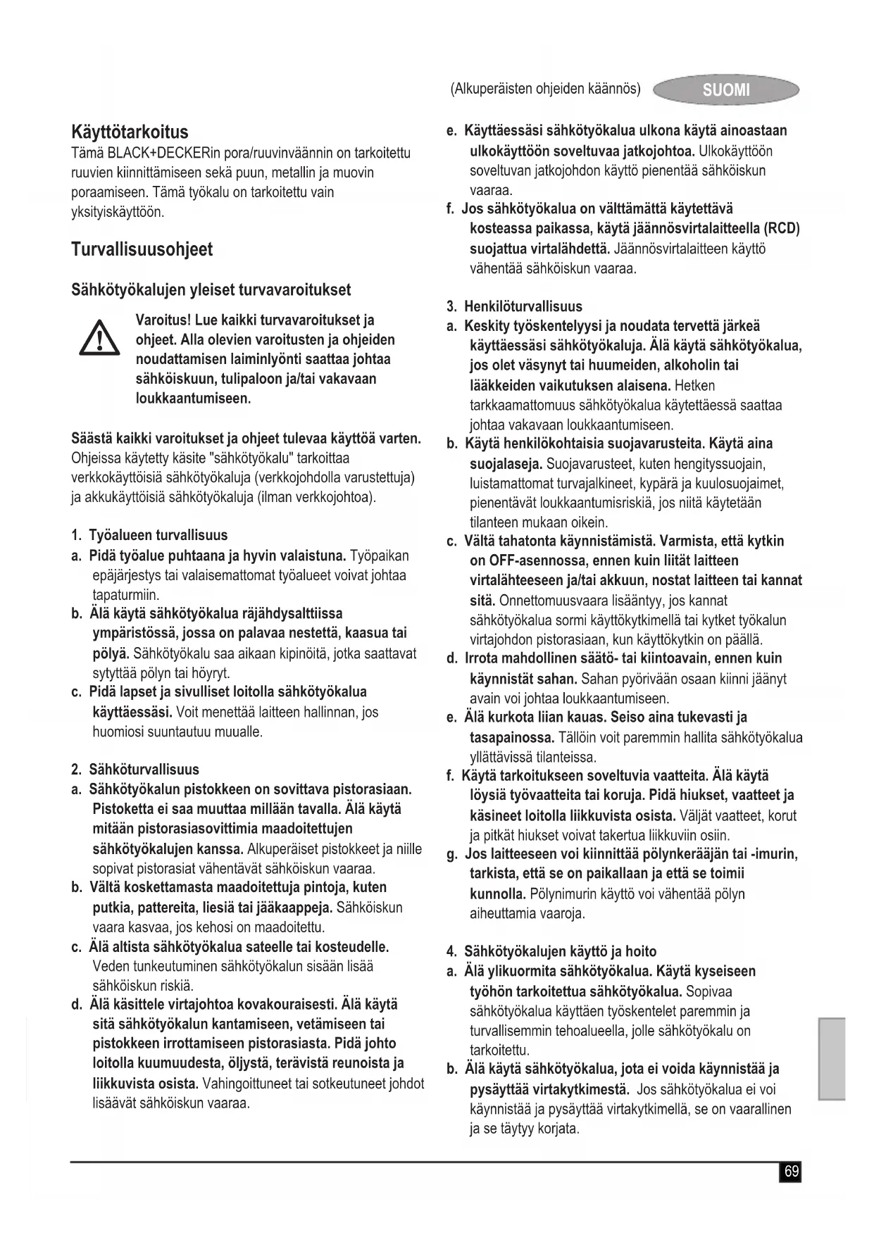 Varoitus! Lue kaikki turvavaroitukset ja ohjeet. Alla olevien varoitusten ja ohjeiden noudattamisen laiminlyönti saattaa johtaa sähköiskuun, tulipaloon ja/tai vakavaan loukkaantumiseen. Säästä kaikki varoitukset ja ohjeet tulevaa käyttöä varten. Ohjeissa käytetty käsite "sähkötyökalu" tarkoittaa verkkokäyttöisiä sähkötyökaluja (verkkojohdolla varustettuja) ja akkukäyttöisiä sähkötyökaluja (ilman verkkojohtoa).