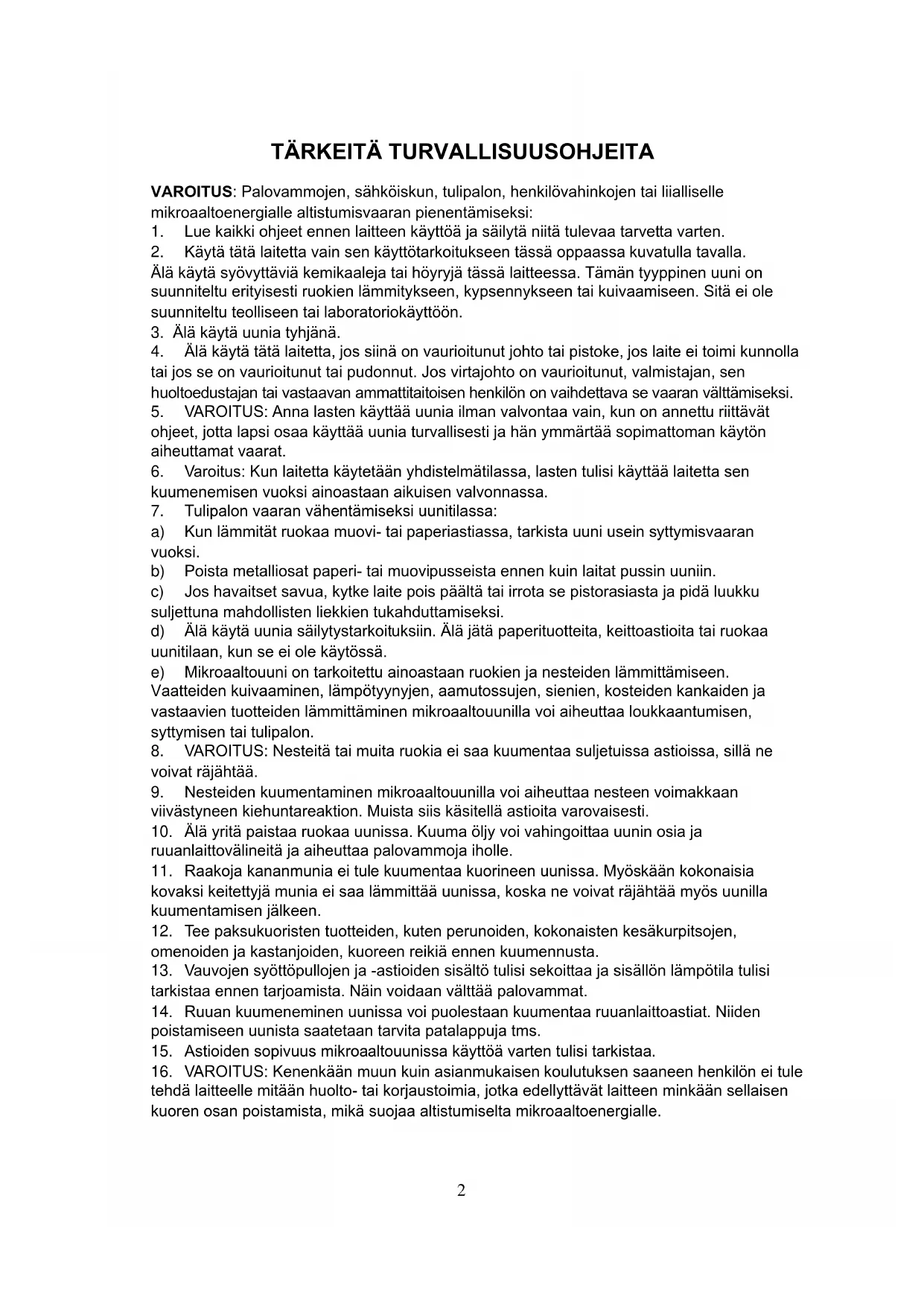 8. VAROITUS: Nesteitä tai muita ruokia ei saa kuumentaa suljetuissa astioissa, sillä ne