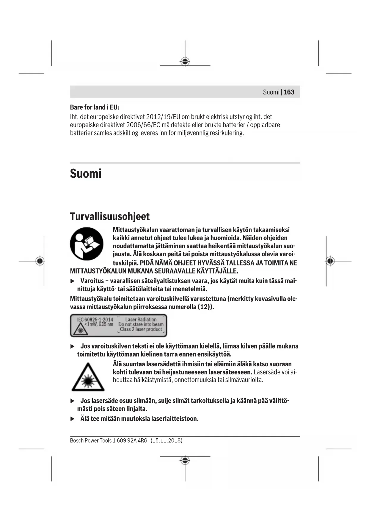 Paina painiketta (3)[+]. Laskettu pinta-ala ja tunnus"+" tulevat näyt- töön. Käynnistä seuraava pinta-alamittaus painamalla mittauspainiketta (2) [ ]. Määritä pinta-ala kappaleen "Pinta-alamittaus" mukaan (katso "Pinta-alamittaus", Sivu170). Heti kun toinen mittaus on saatu päätök- seen, toisen pinta-alamittauksen tulos ilmoitetaan näytön alaosassa. Paina mittauspainiketta (2) [ ] uudelleen näyttääksesi lopputuloksen. Huomautus: pituusmittauksessa lopputulos näytetään välittömästi. Poistu yhteenlaskutoiminnosta painamalla painiketta (7) [Func]. Arvojen vähennyslasku Paina arvojen vähennyslaskutoimitusta varten painiketta (8) [–]. Toimi tästä eteenpäin samalla tavalla kuin kohdassa "Arvojen yhteenlasku". Suomi | 173 Bosch Power Tools 1 609 92A 4RG | (15.11.2018)174 | Suomi 1 609 92A 4RG | (15.11.2018) Bosch Power Tools Mittausarvojen poistaminen Painamalla lyhyesti käynnistyspainiketta (5) [ ] voit poistaa viimeiseksi mitatun mittau- sarvon kaikissa mittaustoiminnoissa. Lyhyillä toistuvilla käynnistyspainikkeen (5) [ ] painalluksilla poistat mittausarvot päinvastaisessa järjestyksessä. Mittayksikön vaihto Mittayksikön perusasetuksena on "m" (metri). Kytke mittaustyökalu päälle. Kun haluat siirtyä "Perusasetukset"-valikkoon , pidä painiketta (7) [Func] painettuna. Valitse "ft/m". Vaihtaaksesi mittayksikköä paina painiketta (3) [+] tai painiketta (8) [–]. Poistu valikkokohdasta painamalla käynnistyspainiketta (5) [ ]. Mittaustyökalun sam- muttamisen jälkeen valittu asetus jää muistiin. Äänen päälle-/poiskytkentä Perusasetuksessa ääni on kytketty päälle. Kytke mittaustyökalu päälle. Kun haluat siirtyä "Perusasetukset"-valikkoon, pidä painiketta (7) [Func] painettuna. Va- litse kohta . Paina painiketta (3) [+] tai painiketta (8) [–], kun haluat kytkeä äänen pois päältä. Poistu valikkokohdasta painamalla mittauspainiketta (2) [ ] tai käynnistyspainiketta (5) [ ]. Mittaustyökalun sammuttamisen jälkeen valittu asetus jää muistiin. Työskentelyohjeita Yleisiä ohjeita Vastaanotinlinssi (14) ja lasersäteen ulostuloaukko (15) eivät saa olla peitettyinä mit- tausta suoritettaessa. Mittaustyökalua ei saa liikuttaa mittauksen aikana. Mikäli suinkin mahdollista, aseta mit- taustyökalu tukevaa alustaa tai tukea vasten. Mittausalueeseen vaikuttavat tekijät Mittausalue riippuu valaistusolosuhteista ja kohdepinnan heijastavuudesta. Käytä kirk- kaasti valaistussa ympäristössä lasersäteen näkyvyyden parantamiseksi lasertarkkailula- seja (17) (lisätarvike) ja laserkohdetaulua (16) (lisätarvike), tai varjosta kohdepinta.Mittaustulokseen vaikuttavat tekijät Fysikaalisten vaikutusten takia on mahdollista, että tietyt pinnat saattavat johtaa mittaus- virheisiin. Tällaisia pintoja ovat esimerkiksi: – läpinäkyvät pinnat (esim. lasi ja vesi), – heijastavat pinnat (esim. lasi ja kiillotettu metalli), – huokoiset pinnat (esim. eristeet) – karkeat pinnat (esim. pohjarappaus ja luonnonkivi). Käytä näillä pinnoilla tarvittaessa lasertähtäintaulua (16) (lisätarvike). Myös vinosti tähdätyt kohdepinnat saattavat johtaa mittausvirheisiin. Samoin erilämpöiset ilmakerrokset tai epäsuorasti vastaanotetut heijastumat saattavat vaikuttaa mittausarvoon. Kaltevuusmittauksen tarkkuuden tarkastus ja kalibrointi (katso kuvatE1–E2) Tarkasta kaltevuusmittauksen tarkkuus säännöllisin välein. Tämä tehdään kääntömittauk- sella. Aseta sitä varten mittaustyökalu pöydälle ja mittaa kaltevuus. Käännä mittaustyö- kalua 180 astetta ja mittaa kaltevuus uudelleen. Mittaustulosten keskinäinen ero saa olla maks. 0,3°. Jos poikkeama on tätä suurempi, mittaustyökalu täytyy kalibroida uudelleen. Valitse sitä varten asetusten kohta . Noudata näytössä näkyviä ohjeita. Voimakkaiden lämpötilanvaihteluiden tai iskuille altistumisen jälkeen suosittelemme te- kemään mittaustyökalun tarkkuuden tarkastuksen ja tarvittaessa kalibroinnin. Lämpöti- lanvaihteluiden jälkeen mittaustyökalun lämpötilan on annettava tasoittua jonkin aikaa ennen kalibroinnin suorittamista. Etäisyysmittauksen tarkkuuden tarkastus Voit tarkastaa mittaustyökalun tarkkuuden seuraavasti: – Valitse noin 3–10m pituinen pysyvästi muuttumaton mittausmatka, jonka pituuden tunnet tarkasti (esim. huoneen leveys, oviaukko). Mittaus tulee suorittaa edullisissa olosuhteissa, ts. mittausmatkan tulee olla sisätilassa, taustaltaan heikosti valaistu ja kohdepinnan täytyy olla sileä ja heijastuskykyinen. – Mittaa matka 10 kertaa peräkkäin. Yksittäiset mittaustulokset saavat poiketa keskiarvosta enintään ±4mm koko mittaus- matkalla ja hyvissä olosuhteissa. Kirjaa mittaustulokset muistiin, jotta voit verrata tark- kuutta myöhemmin. Työskentely jalustan (lisätarvike) kanssa Jalustan käyttö on välttämätöntä varsinkin suuremmilla etäisyyksillä. Asenna 1/4":n kier- teellä (13) varustettu mittaustyökalu jalustan (18) tai tavanomaisen kamerajalustan pi- kavaihtolevyyn. Kiinnitä se pikavaihtolevyn lukitusruuvilla. Suomi | 175 Bosch Power Tools 1 609 92A 4RG | (15.11.2018)176 | Suomi 1 609 92A 4RG | (15.11.2018) Bosch Power Tools Säädä jalustan kanssa tehtäviin mittauksiin asiaankuuluva vertailutaso (kierre) paina- malla painiketta (4). Virheilmoitus Jos mittausta ei voi suorittaa oikein, näyttöön tulee virheilmoitus "Error". Kytke mittaus- työkalu pois päältä ja sen jälkeen taas päälle ja käynnistä mittaus uudelleen. Mittaustyökalu valvoo omaa toimintaansa jokaisen mittauksen yhtey- dessä. Jos se havaitsee vian, näytössä näkyy enää vain viereinen tunnus ja mittaustyökalu kytkeytyy pois päältä. Tällöin mittaustyökalu tulee toi- mittaa jälleenmyyjälle, joka lähettää sen Bosch-huoltoon. Hoito ja huolto Huolto ja puhdistus Pidä aina mittaustyökalu puhtaana. Älä koskaan upota mittaustyökalua veteen tai muihin nesteisiin. Pyyhi lika pois kostealla ja pehmeällä liinalla. Älä käyt