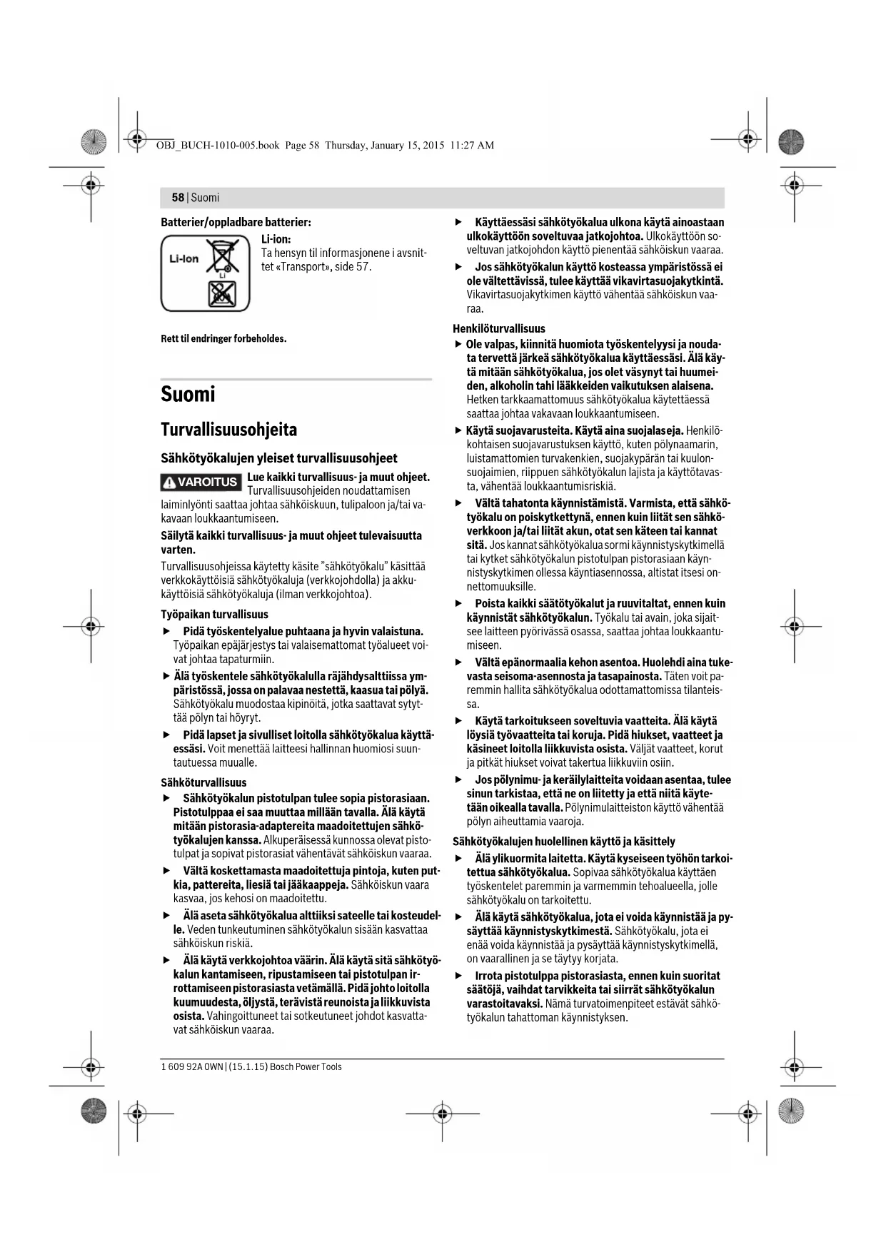 skruelengden. Service og vedlikehold Vedlikehold og rengjøring Ta batteriet ut av elektroverktøyet før alle arbeider på elektroverktøyet utføres (f. eks. vedlikehold, verktøy- skifte osv.) hhv. ved transport og oppbevaring. Det er fare for skader hvis du trykker på på-/av-bryteren ved en feiltagelse. Hold elektroverktøyet og ventilasjonsspaltene alltid rene, for å kunne arbeide bra og sikkert. Hvis batteriet ikke lenger er funksjonsdyktig, må du henvende deg til en autorisert kundeservice for Bosch-elektroverktøy. Hold verktøyfestet 2 og innsatsverktøyet alltid rent, for å sikre låsefunksjonen til låsehylsen 3. Kundeservice og rådgivning ved bruk Kundeservicen svarer på dine spørsmål om reparasjon og vedlikehold av produktet samt om reservedeleler. Spreng- skisser og informasjon om reservedeler finner du også på: www.bosch-pt.com Bosch rådgivningsteamet hjelper deg gjerne ved spørsmål an- gående våre produkter og deres tilbehør. Ved alle forespørsler og reservedelsbestillinger må du oppgi det 10-sifrede produktnummeret som er angitt på elektro- verktøyets typeskilt. Norsk Robert Bosch AS Postboks 350 1402 Ski Tel.: 64 87 89 50 Faks: 64 87 89 55 Transport Li-ion-batteriene i verktøyet underligger kravene for farlig gods. Batteriene kan transporteres på veier av brukeren uten ytterligere krav. Ved forsendelse gjennom tredje personer (f. eks.: lufttran- sport eller spedisjon) må det oppfylles spesielle krav til em- ballasje og merking. Du må da konsultere en ekspert for farlig gods ved forberedelse av forsendelsen. Send batterier kun hvis huset ikke er skadet. Lim igjen de åp- ne kontaktene og pakk batteriet slik at det ikke beveger seg i emballasjen. Ta også hensyn til eventuelle videreførende nasjonale for- skrifter. Deponering Elektroverktøy, batterier, tilbehør og emballasje må leveres inn til miljøvennlig gjenvinning. Elektroverktøy og batterier må ikke kastes i vanlig søppel! Kun for EU-land: Iht. det europeiske direktivet 2012/19/EU om gamle elektriske apparater og iht. det europeiske direktivet 2006/66/EC må de- fekte eller oppbrukte batterier/oppladbare batterier samles inn adskilt og leveres inn til en miljøvennlig resirkulering. OBJ_BUCH-1010-005.book Page 57 Thursday, January 15, 2015 11:27 AM58 | Suomi 1 609 92A 0WN | (15.1.15) Bosch Power Tools Batterier/oppladbare batterier: Li-ion: Ta hensyn til informasjonene i avsnit- tet «Transport», side 57. Rett til endringer forbeholdes. Suomi Turvallisuusohjeita Sähkötyökalujen yleiset turvallisuusohjeet Lue kaikki turvallisuus- ja muut ohjeet. Turvallisuusohjeiden noudattamisen laiminlyönti saattaa johtaa sähköiskuun, tulipaloon ja/tai va- kavaan loukkaantumiseen. Säilytä kaikki turvallisuus- ja muut ohjeet tulevaisuutta varten. Turvallisuusohjeissa käytetty käsite ”sähkötyökalu” käsittää verkkokäyttöisiä sähkötyökaluja (verkkojohdolla) ja akku- käyttöisiä sähkötyökaluja (ilman verkkojohtoa). Työpaikan turvallisuus Pidä työskentelyalue puhtaana ja hyvin valaistuna. Työpaikan epäjärjestys tai valaisemattomat työalueet voi- vat johtaa tapaturmiin. Älä työskentele sähkötyökalulla räjähdysalttiissa ym- päristössä, jossa on palavaa nestettä, kaasua tai pölyä. Sähkötyökalu muodostaa kipinöitä, jotka saattavat sytyt- tää pölyn tai höyryt. Pidä lapset ja sivulliset loitolla sähkötyökalua käyttä- essäsi. Voit menettää laitteesi hallinnan huomiosi suun- tautuessa muualle. Sähköturvallisuus Sähkötyökalun pistotulpan tulee sopia pistorasiaan. Pistotulppaa ei saa muuttaa millään tavalla. Älä käytä mitään pistorasia-adaptereita maadoitettujen sähkö- työkalujen kanssa. Alkuperäisessä kunnossa olevat pisto- tulpat ja sopivat pistorasiat vähentävät sähköiskun vaaraa. Vältä koskettamasta maadoitettuja pintoja, kuten put- kia, pattereita, liesiä tai jääkaappeja. Sähköiskun vaara kasvaa, jos kehosi on maadoitettu. Älä aseta sähkötyökalua alttiiksi sateelle tai kosteudel- le. Veden tunkeutuminen sähkötyökalun sisään kasvattaa sähköiskun riskiä. Älä käytä verkkojohtoa väärin. Älä käytä sitä sähkötyö- kalun kantamiseen, ripustamiseen tai pistotulpan ir- rottamiseen pistorasiasta vetämällä. Pidä johto loitolla kuumuudesta, öljystä, terävistä reunoista ja liikkuvista osista. Vahingoittuneet tai sotkeutuneet johdot kasvatta- vat sähköiskun vaaraa. Käyttäessäsi sähkötyökalua ulkona käytä ainoastaan ulkokäyttöön soveltuvaa jatkojohtoa. Ulkokäyttöön so- veltuvan jatkojohdon käyttö pienentää sähköiskun vaaraa. Jos sähkötyökalun käyttö kosteassa ympäristössä ei ole vältettävissä, tulee käyttää vikavirtasuojakytkintä. Vikavirtasuojakytkimen käyttö vähentää sähköiskun vaa- raa. Henkilöturvallisuus Ole valpas, kiinnitä huomiota työskentelyysi ja nouda- ta tervettä järkeä sähkötyökalua käyttäessäsi. Älä käy- tä mitään sähkötyökalua, jos olet väsynyt tai huumei- den, alkoholin tahi lääkkeiden vaikutuksen alaisena. Hetken tarkkaamattomuus sähkötyökalua käytettäessä saattaa johtaa vakavaan loukkaantumiseen. Käytä suojavarusteita. Käytä aina suojalaseja. Henkilö- kohtaisen suojavarustuksen käyttö, kuten pölynaamarin, luistamattomien turvakenkien, suojakypärän tai kuulon- suojaimien, riippuen sähkötyökalun lajista ja käyttötavas- ta, vähentää loukkaantumisriskiä. Vältä tahatonta käynnistämistä. Varmista, että sähkö- työkalu on poiskytkettynä, ennen kuin liität sen sähkö- verkkoon ja/tai liität akun, otat sen käteen tai kannat sitä. Jos kannat sähkötyökalua sormi käynnistyskytkimellä tai kytket sähkötyökalun pistotulpan pistorasiaan käyn- nistyskytkimen ollessa käyntiasennossa, altistat itsesi on- nettomuuksille. Poista kaikki säätötyökalut ja ruuvitaltat, ennen kuin käynnistät sähkötyökalun. Työkalu tai avain, joka sijait- see laitteen pyörivässä osassa, saat