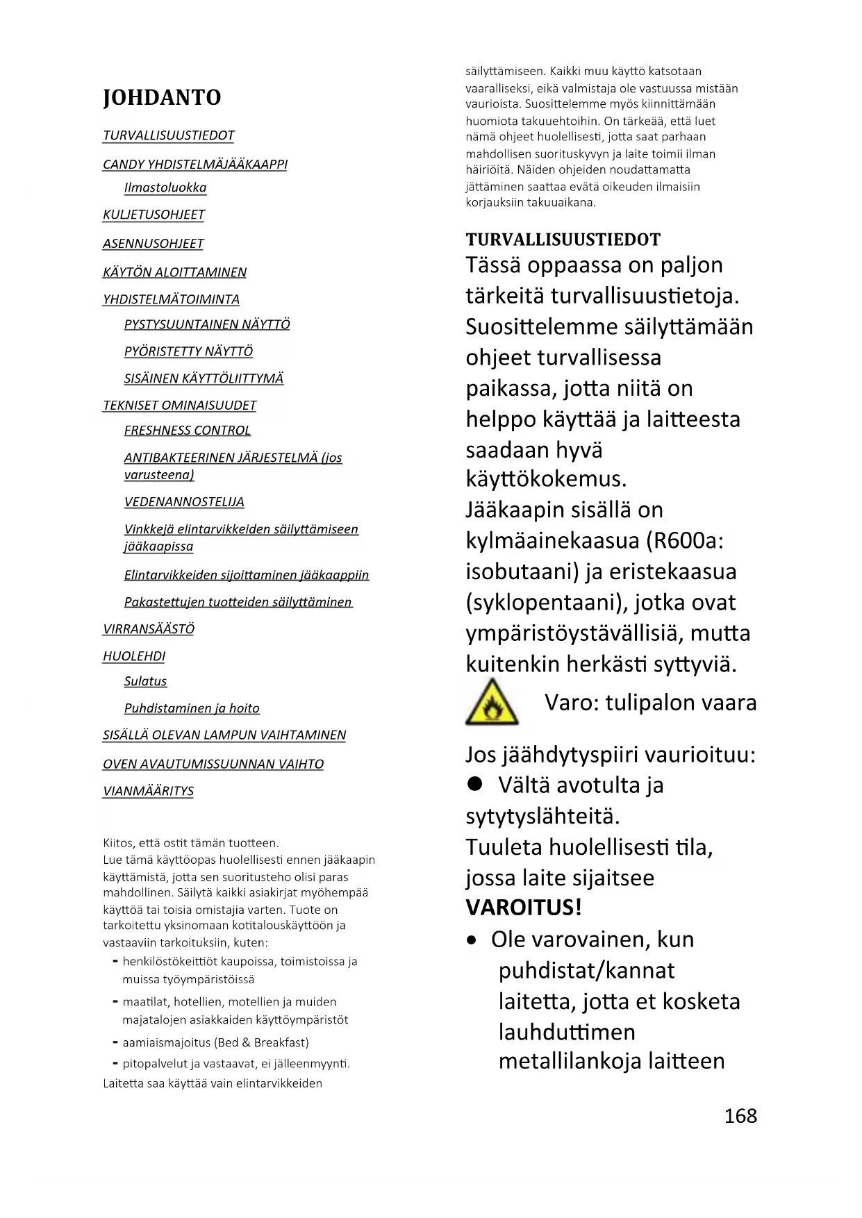 Termostater, temperatursensorer, kretskort och ljuskällor, under minst sju år efter det att den sista167 modellen av modellen släppts ut på marknaden. Dörrhandtag, dörrgångjärn, brickor och korgar under minst sju år och dörrpackningar under minst 10 år efter att den sista modellen av modellen har släppts ut på marknaden. Mer information om produkten finns på https://eprel.ec.europa.eu/ eller skannar QR på energimärket som medföljer apparaten.168 Suomi JOHDANTO TURVALLISUUSTIEDOT CANDY YHDISTELMÄJÄÄKAAPPI Ilmastoluokka KULJETUSOHJEET ASENNUSOHJEET KÄYTÖN ALOITTAMINEN YHDISTELMÄTOIMINTA PYSTYSUUNTAINEN NÄYTTÖ PYÖRISTETTY NÄYTTÖ SISÄINEN KÄYTTÖLIITTYMÄ TEKNISET OMINAISUUDET FRESHNESS CONTROL ANTIBAKTEERINEN JÄRJESTELMÄ (jos varusteena) VEDENANNOSTELIJA Vinkkejä elintarvikkeiden säilyttämiseen jääkaapissa Elintarvikkeiden sijoittaminen jääkaappiin Pakastettujen tuotteiden säilyttäminen VIRRANSÄÄSTÖ HUOLEHDI Sulatus Puhdistaminen ja hoito SISÄLLÄ OLEVAN LAMPUN VAIHTAMINEN OVEN AVAUTUMISSUUNNAN VAIHTO VIANMÄÄRITYS Kiitos, että ostit tämän tuotteen. Lue tämä käyttöopas huolellisesti ennen jääkaapin käyttämistä, jotta sen suoritusteho olisi paras mahdollinen. Säilytä kaikki asiakirjat myöhempää käyttöä tai toisia omistajia varten. Tuote on tarkoitettu yksinomaan kotitalouskäyttöön ja vastaaviin tarkoituksiin, kuten: - henkilöstökeittiöt kaupoissa, toimistoissa ja muissa työympäristöissä - maatilat, hotellien, motellien ja muiden majatalojen asiakkaiden käyttöympäristöt - aamiaismajoitus (Bed & Breakfast) - pitopalvelut ja vastaavat, ei jälleenmyynti. Laitetta saa käyttää vain elintarvikkeiden säilyttämiseen. Kaikki muu käyttö katsotaan vaaralliseksi, eikä valmistaja ole vastuussa mistään vaurioista. Suosittelemme myös kiinnittämään huomiota takuuehtoihin. On tärkeää, että luet nämä ohjeet huolellisesti, jotta saat parhaan mahdollisen suorituskyvyn ja laite toimii ilman häiriöitä. Näiden ohjeiden noudattamatta jättäminen saattaa evätä oikeuden ilmaisiin korjauksiin takuuaikana. TURVALLISUUSTIEDOT Tässä oppaassa on paljon tärkeitä turvallisuustietoja. Suosittelemme säilyttämään ohjeet turvallisessa paikassa, jotta niitä on helppo käyttää ja laitteesta saadaan hyvä käyttökokemus. Jääkaapin sisällä on kylmäainekaasua (R600a: isobutaani) ja eristekaasua (syklopentaani), jotka ovat ympäristöystävällisiä, mutta kuitenkin herkästi syttyviä.