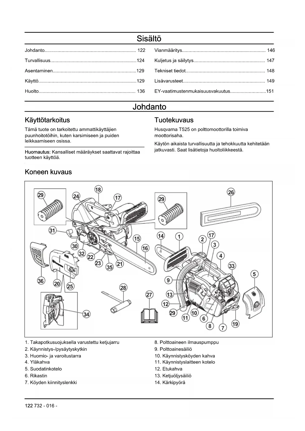 - EY-vaatimustenmukaisuusvakuutus Johdanto Käyttötarkoitus Tämä tuote on tarkoitettu ammattikäyttäjien puunhoitotöihin, kuten karsimiseen ja puiden leikkaamiseen osissa. Huomautus: Kansalliset määräykset saattavat rajoittaa tuotteen käyttöä. Tuotekuvaus Husqvarna T525 on polttomoottorilla toimiva moottorisaha. Käytön aikaista turvallisuutta ja tehokkuutta kehitetään jatkuvasti. Saat lisätietoja huoltoliikkeestä. Koneen kuvaus p. 151