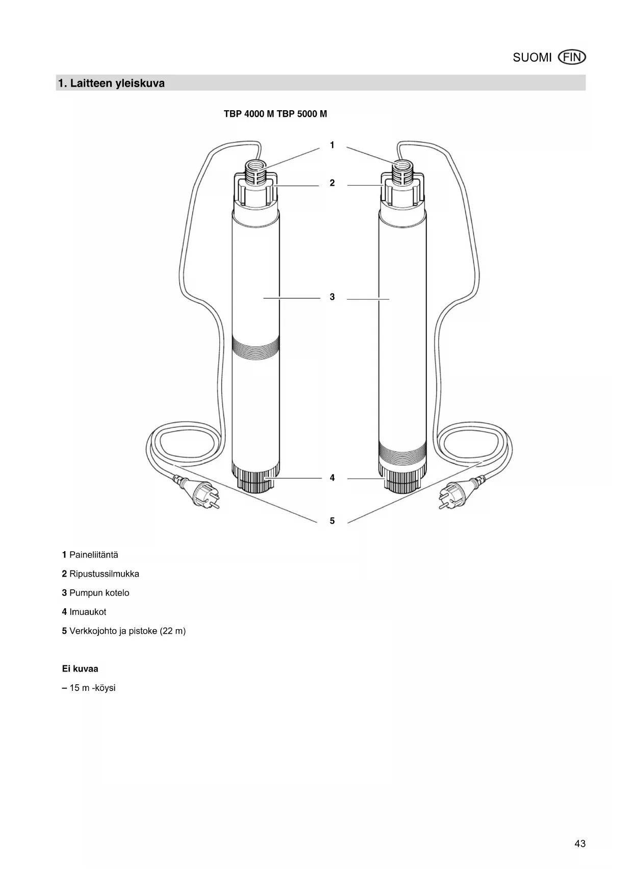 - 1 Paineliitäntä 2 Ripustussilmukka 3 Pumpun kotelo 4 Imuaukot 5 Verkkojohto ja pistoke (22 m) Ei kuvaa – 15 m -köysi XP0028FI5.fm Alkuperäiskäyttöohje DEUTSCH44 SUOMI 1. Laitteen yleiskuva p. 432