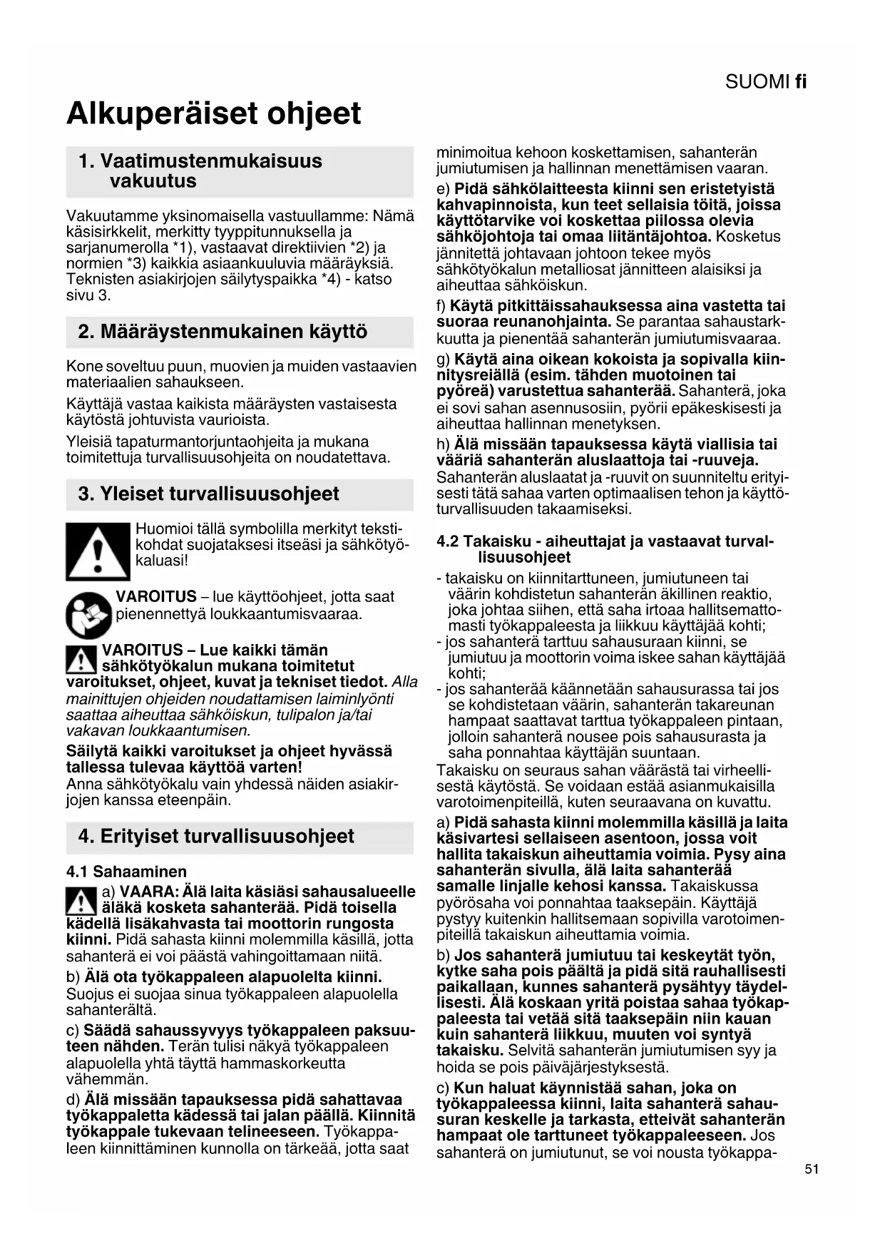 Alkuperäiset ohjeet Vakuutamme yksinomaisella vastuullamme: Nämä käsisirkkelit, merkitty tyyppitunnuksella ja sarjanumerolla *1), vastaavat direktiivien *2) ja normien *3) kaikkia asiaankuuluvia määräyksiä. Teknisten asiakirjojen säilytyspaikka *4) - katso sivu 3. Kone soveltuu puun, muovien ja muiden vastaavien materiaalien sahaukseen. Käyttäjä vastaa kaikista määräysten vastaisesta käytöstä johtuvista vaurioista. Yleisiä tapaturmantorjuntaohjeita ja mukana toimitettuja turvallisuusohjeita on noudatettava. Huomioi tällä symbolilla merkityt teksti- kohdat suojataksesi itseäsi ja sähkötyö- kaluasi! VAROITUS – lue käyttöohjeet, jotta saat pienennettyä loukkaantumisvaaraa. VAROITUS – Lue kaikki tämän sähkötyökalun mukana toimitetut varoitukset, ohjeet, kuvat ja tekniset tiedot. Alla mainittujen ohjeiden noudattamisen laiminlyönti saattaa aiheuttaa sähköiskun, tulipalon ja/tai vakavan loukkaantumisen. Säilytä kaikki varoitukset ja ohjeet hyvässä tallessa tulevaa käyttöä varten! Anna sähkötyökalu vain yhdessä näiden asiakir- jojen kanssa eteenpäin.