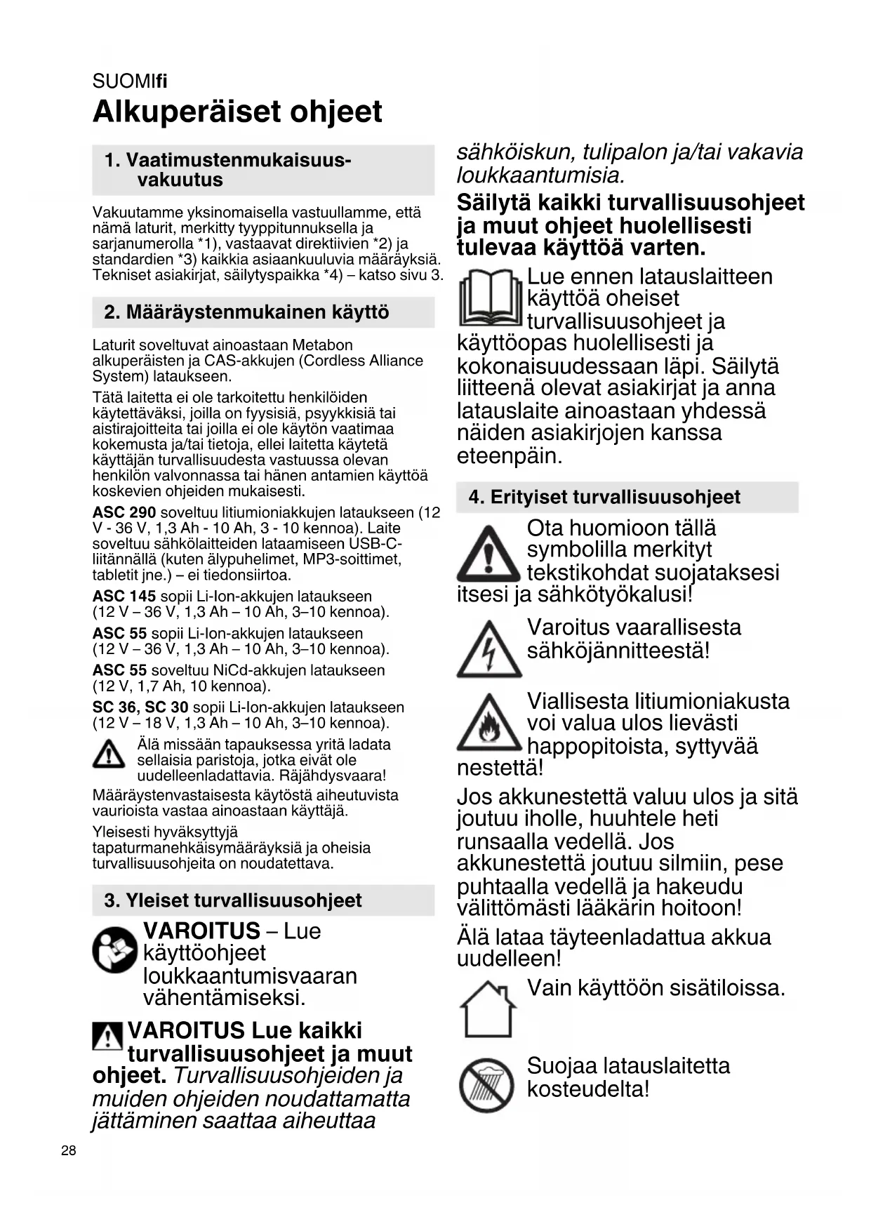 Alkuperäiset ohjeet Vakuutamme yksinomaisella vastuullamme, että nämä laturit, merkitty tyyppitunnuksella ja sarjanumerolla *1), vastaavat direktiivien *2) ja standardien *3) kaikkia asiaankuuluvia määräyksiä. Tekniset asiakirjat, säilytyspaikka *4) – katso sivu 3. Laturit soveltuvat ainoastaan Metabon alkuperäisten ja CAS-akkujen (Cordless Alliance System) lataukseen. Tätä laitetta ei ole tarkoitettu henkilöiden käytettäväksi, joilla on fyysisiä, psyykkisiä tai aistirajoitteita tai joilla ei ole käytön vaatimaa kokemusta ja/tai tietoja, ellei laitetta käytetä käyttäjän turvallisuudesta vastuussa olevan henkilön valvonnassa tai hänen antamien käyttöä koskevien ohjeiden mukaisesti. ASC 290 soveltuu litiumioniakkujen lataukseen (12 V - 36 V, 1,3 Ah - 10 Ah, 3 - 10 kennoa). Laite soveltuu sähkölaitteiden lataamiseen USB-C- liitännällä (kuten älypuhelimet, MP3-soittimet, tabletit jne.) – ei tiedonsiirtoa. ASC 145 sopii Li-Ion-akkujen lataukseen (12 V – 36 V, 1,3 Ah – 10 Ah, 3–10 kennoa). ASC 55 sopii Li-Ion-akkujen lataukseen (12 V – 36 V, 1,3 Ah – 10 Ah, 3–10 kennoa). ASC 55 soveltuu NiCd-akkujen lataukseen (12 V, 1,7 Ah, 10 kennoa). SC 36, SC 30 sopii Li-Ion-akkujen lataukseen (12 V – 18 V, 1,3 Ah – 10 Ah, 3–10 kennoa). Älä missään tapauksessa yritä ladata sellaisia paristoja, jotka eivät ole uudelleenladattavia. Räjähdysvaara! Määräystenvastaisesta käytöstä aiheutuvista vaurioista vastaa ainoastaan käyttäjä. Yleisesti hyväksyttyjä tapaturmanehkäisymääräyksiä ja oheisia turvallisuusohjeita on noudatettava. VAROITUS – Lue käyttöohjeet loukkaantumisvaaran vähentämiseksi. VAROITUS Lue kaikki turvallisuusohjeet ja muut ohjeet. Turvallisuusohjeiden ja muiden ohjeiden noudattamatta jättäminen saattaa aiheuttaa sähköiskun, tulipalon ja/tai vakavia loukkaantumisia. Säilytä kaikki turvallisuusohjeet ja muut ohjeet huolellisesti tulevaa käyttöä varten. Lue ennen latauslaitteen käyttöä oheiset turvallisuusohjeet ja käyttöopas huolellisesti ja kokonaisuudessaan läpi. Säilytä liitteenä olevat asiakirjat ja anna latauslaite ainoastaan yhdessä näiden asiakirjojen kanssa eteenpäin. Ota huomioon tällä symbolilla merkityt tekstikohdat suojataksesi itsesi ja sähkötyökalusi! Varoitus vaarallisesta sähköjännitteestä! Viallisesta litiumioniakusta voi valua ulos lievästi happopitoista, syttyvää nestettä! Jos akkunestettä valuu ulos ja sitä joutuu iholle, huuhtele heti runsaalla vedellä. Jos akkunestettä joutuu silmiin, pese puhtaalla vedellä ja hakeudu välittömästi lääkärin hoitoon! Älä lataa täyteenladattua akkua uudelleen! Vain käyttöön sisätiloissa. Suojaa latauslaitetta kosteudelta!