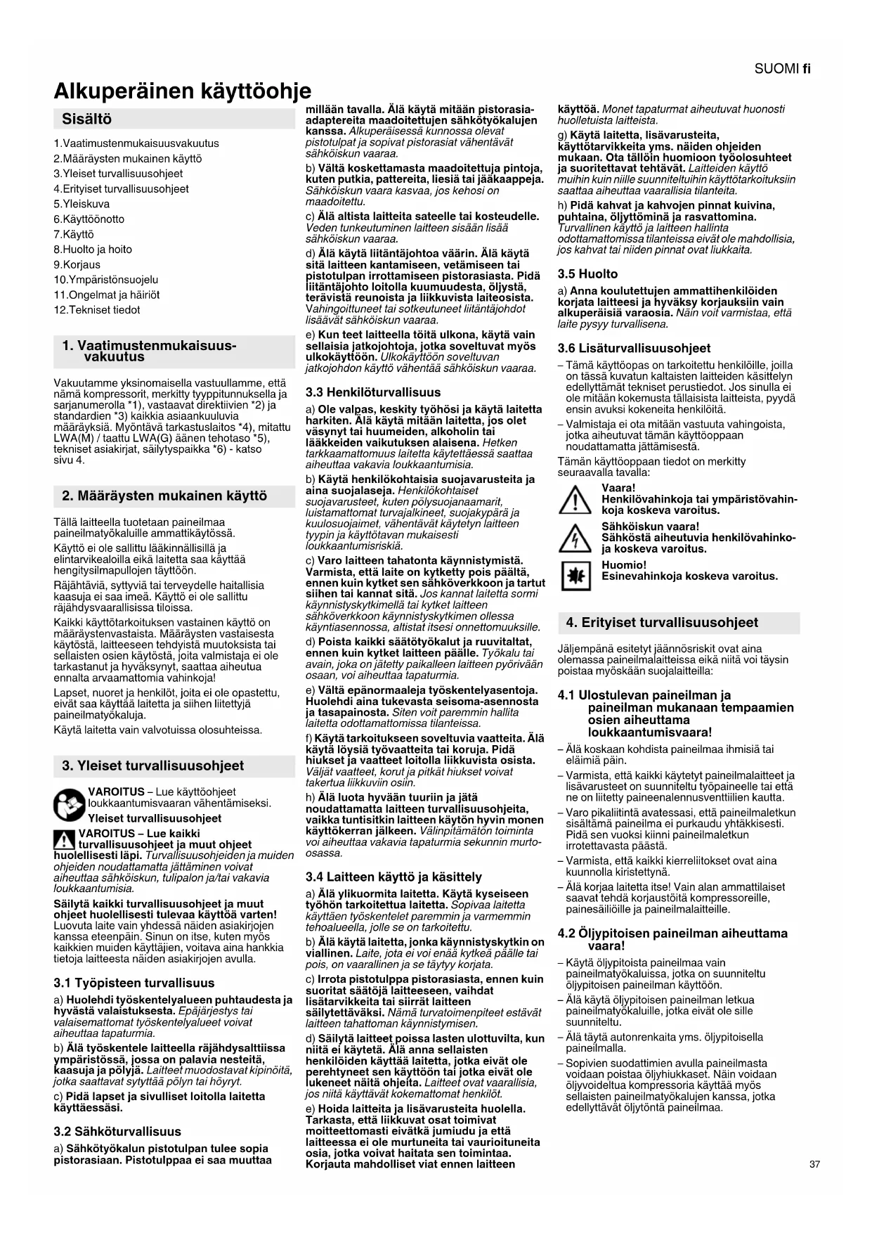 Alkuperäinen käyttöohje 1.Vaatimustenmukaisuusvakuutus 2.Määräysten mukainen käyttö 3.Yleiset turvallisuusohjeet 4.Erityiset turvallisuusohjeet 5.Yleiskuva 6.Käyttöönotto 7.Käyttö 8.Huolto ja hoito 9.Korjaus 10.Ympäristönsuojelu 11.Ongelmat ja häiriöt 12.Tekniset tiedot Vakuutamme yksinomaisella vastuullamme, että nämä kompressorit, merkitty tyyppitunnuksella ja sarjanumerolla *1), vastaavat direktiivien *2) ja standardien *3) kaikkia asiaankuuluvia määräyksiä. Myöntävä tarkastuslaitos *4), mitattu LWA(M) / taattu LWA(G) äänen tehotaso *5), tekniset asiakirjat, säilytyspaikka *6) - katso sivu 4. Tällä laitteella tuotetaan paineilmaa paineilmatyökaluille ammattikäytössä. Käyttö ei ole sallittu lääkinnällisillä ja elintarvikealoilla eikä laitetta saa käyttää hengitysilmapullojen täyttöön. Räjähtäviä, syttyviä tai terveydelle haitallisia kaasuja ei saa imeä. Käyttö ei ole sallittu räjähdysvaarallisissa tiloissa. Kaikki käyttötarkoituksen vastainen käyttö on määräystenvastaista. Määräysten vastaisesta käytöstä, laitteeseen tehdyistä muutoksista tai sellaisten osien käytöstä, joita valmistaja ei ole tarkastanut ja hyväksynyt, saattaa aiheutua ennalta arvaamattomia vahinkoja! Lapset, nuoret ja henkilöt, joita ei ole opastettu, eivät saa käyttää laitetta ja siihen liitettyjä paineilmatyökaluja. Käytä laitetta vain valvotuissa olosuhteissa. VAROITUS – Lue käyttöohjeet loukkaantumisvaaran vähentämiseksi. Yleiset turvallisuusohjeet VAROITUS – Lue kaikki turvallisuusohjeet ja muut ohjeet huolellisesti läpi. Turvallisuusohjeiden ja muiden ohjeiden noudattamatta jättäminen voivat aiheuttaa sähköiskun, tulipalon ja/tai vakavia loukkaantumisia. Säilytä kaikki turvallisuusohjeet ja muut ohjeet huolellisesti tulevaa käyttöä varten! Luovuta laite vain yhdessä näiden asiakirjojen kanssa eteenpäin. Sinun on itse, kuten myös kaikkien muiden käyttäjien, voitava aina hankkia tietoja laitteesta näiden asiakirjojen avulla.