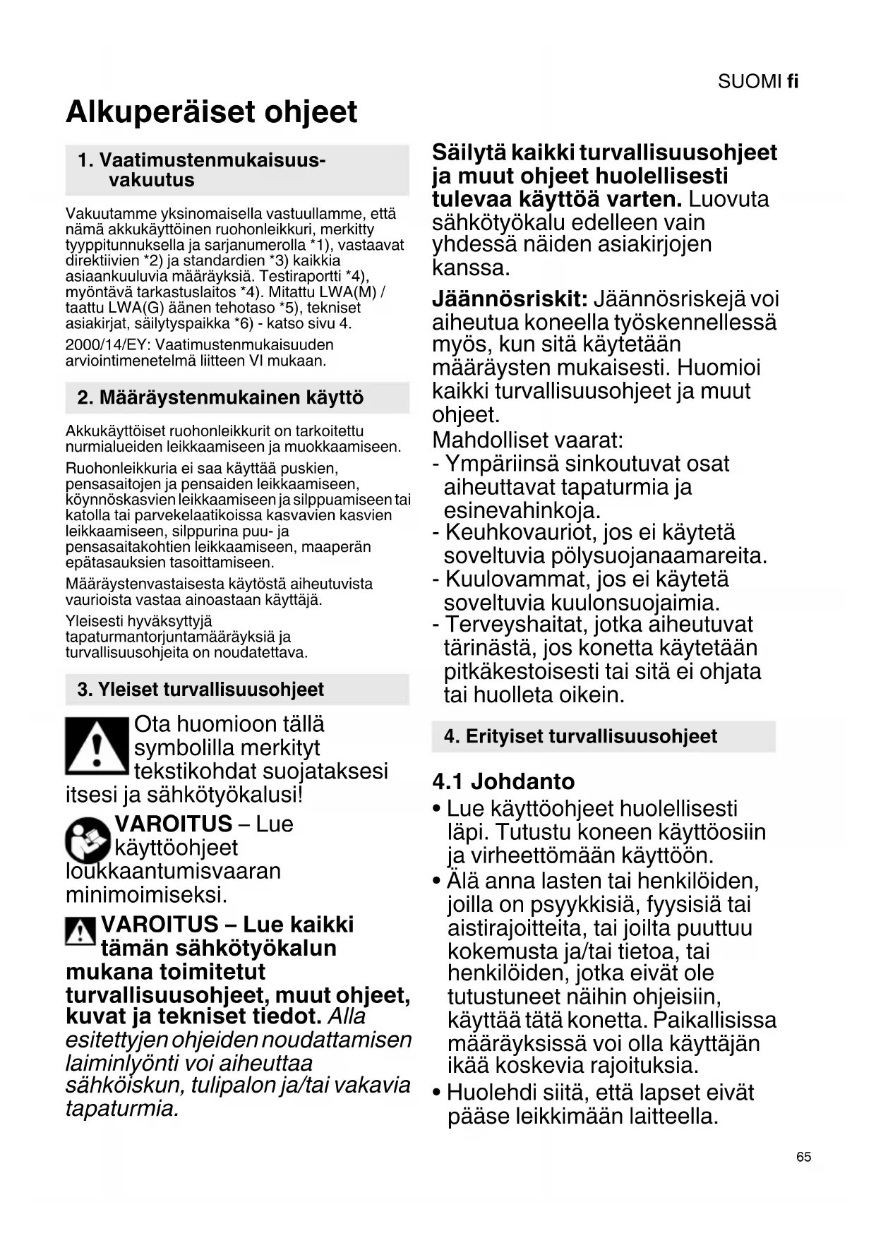 Alkuperäiset ohjeet Vakuutamme yksinomaisella vastuullamme, että nämä akkukäyttöinen ruohonleikkuri, merkitty tyyppitunnuksella ja sarjanumerolla *1), vastaavat direktiivien *2) ja standardien *3) kaikkia asiaankuuluvia määräyksiä. Testiraportti *4), myöntävä tarkastuslaitos *4). Mitattu LWA(M) / taattu LWA(G) äänen tehotaso *5), tekniset asiakirjat, säilytyspaikka *6) - katso sivu 4. 2000/14/EY: Vaatimustenmukaisuuden arviointimenetelmä liitteen VI mukaan. Akkukäyttöiset ruohonleikkurit on tarkoitettu nurmialueiden leikkaamiseen ja muokkaamiseen. Ruohonleikkuria ei saa käyttää puskien, pensasaitojen ja pensaiden leikkaamiseen, köynnöskasvien leikkaamiseen ja silppuamiseen tai katolla tai parvekelaatikoissa kasvavien kasvien leikkaamiseen, silppurina puu- ja pensasaitakohtien leikkaamiseen, maaperän epätasauksien tasoittamiseen. Määräystenvastaisesta käytöstä aiheutuvista vaurioista vastaa ainoastaan käyttäjä. Yleisesti hyväksyttyjä tapaturmantorjuntamääräyksiä ja turvallisuusohjeita on noudatettava. Ota huomioon tällä symbolilla merkityt tekstikohdat suojataksesi itsesi ja sähkötyökalusi! VAROITUS – Lue käyttöohjeet loukkaantumisvaaran minimoimiseksi. VAROITUS – Lue kaikki tämän sähkötyökalun mukana toimitetut turvallisuusohjeet, muut ohjeet, kuvat ja tekniset tiedot. Alla esitettyjen ohjeiden noudattamisen laiminlyönti voi aiheuttaa sähköiskun, tulipalon ja/tai vakavia tapaturmia. Säilytä kaikki turvallisuusohjeet ja muut ohjeet huolellisesti tulevaa käyttöä varten. Luovuta sähkötyökalu edelleen vain yhdessä näiden asiakirjojen kanssa. Jäännösriskit: Jäännösriskejä voi aiheutua koneella työskennellessä myös, kun sitä käytetään määräysten mukaisesti. Huomioi kaikki turvallisuusohjeet ja muut ohjeet. Mahdolliset vaarat: - Ympäriinsä sinkoutuvat osat aiheuttavat tapaturmia ja esinevahinkoja. - Keuhkovauriot, jos ei käytetä soveltuvia pölysuojanaamareita. - Kuulovammat, jos ei käytetä soveltuvia kuulonsuojaimia. - Terveyshaitat, jotka aiheutuvat tärinästä, jos konetta käytetään pitkäkestoisesti tai sitä ei ohjata tai huolleta oikein.