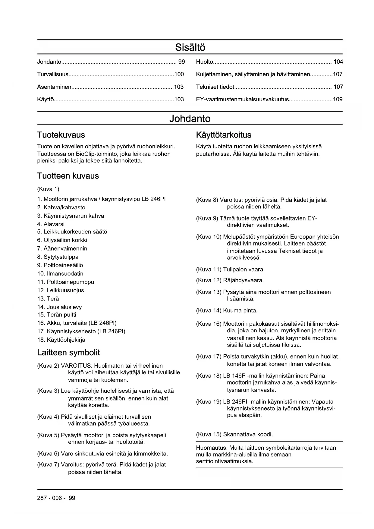 Laitteen symbolit (Kuva 2) VAROITUS: Huolimaton tai virheellinen käyttö voi aiheuttaa käyttäjälle tai sivullisille vammoja tai kuoleman. (Kuva 3) Lue käyttöohje huolellisesti ja varmista, että ymmärrät sen sisällön, ennen kuin alat käyttää konetta. (Kuva 4) Pidä sivulliset ja eläimet turvallisen välimatkan päässä työalueesta. (Kuva 5) Pysäytä moottori ja poista sytytyskaapeli ennen korjaus- tai huoltotöitä. (Kuva 6) Varo sinkoutuvia esineitä ja kimmokkeita. (Kuva 7) Varoitus: pyörivä terä. Pidä kädet ja jalat poissa niiden läheltä. (Kuva 8) Varoitus: pyöriviä osia. Pidä kädet ja jalat poissa niiden läheltä. (Kuva 9) Tämä tuote täyttää sovellettavien EY- direktiivien vaatimukset. (Kuva 10) Melupäästöt ympäristöön Euroopan yhteisön direktiivin mukaisesti. Laitteen päästöt ilmoitetaan luvussa Tekniset tiedot ja arvokilvessä. (Kuva 11) Tulipalon vaara. (Kuva 12) Räjähdysvaara. (Kuva 13) Pysäytä aina moottori ennen polttoaineen lisäämistä. (Kuva 14) Kuuma pinta. (Kuva 16) Moottorin pakokaasut sisältävät hiilimonoksi- dia, joka on hajuton, myrkyllinen ja erittäin vaarallinen kaasu. Älä käynnistä moottoria sisällä tai suljetuissa tiloissa. (Kuva 17) Poista turvakytkin (akku), ennen kuin huollat konetta tai jätät koneen ilman valvontaa. (Kuva 18) LB 146P -mallin käynnistäminen: Paina moottorin jarrukahva alas ja vedä käynnis- tysnarun kahvasta. (Kuva 19) LB 246PI -mallin käynnistäminen: Vapauta käynnistyksenesto ja työnnä käynnistysvi- pua alaspäin. (Kuva 15) Skannattava koodi. Huomautus: Muita laitteen symboleita/tarroja tarvitaan muilla markkina-alueilla ilmaisemaan sertifiointivaatimuksia.