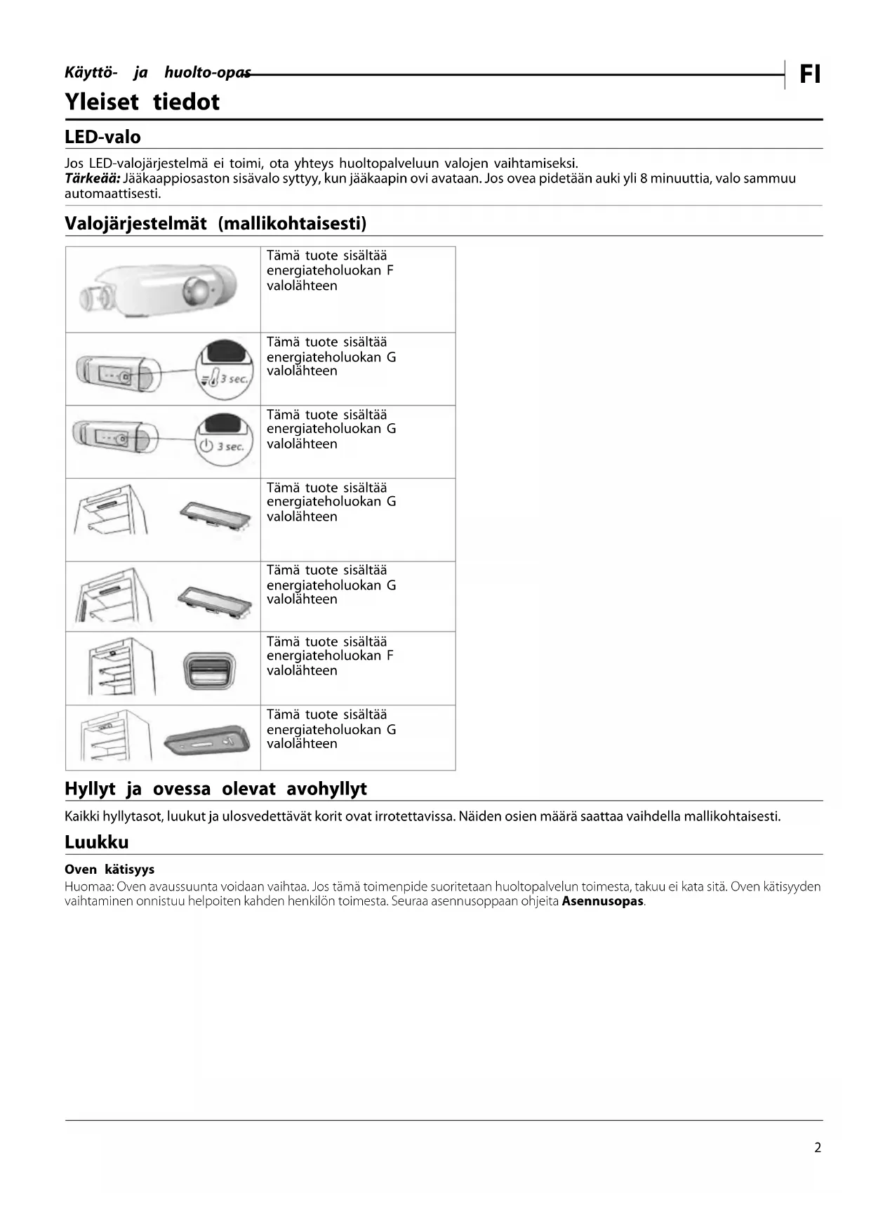 Yleiset tiedot LED-valo Jos LED-valojärjestelmä ei toimi, ota yhteys huoltopalveluun valojen vaihtamiseksi. Tärkeää: Jääkaappiosaston sisävalo syttyy, kun jääkaapin ovi avataan. Jos ovea pidetään auki yli 8 minuuttia, valo sammuu automaattisesti. Valojärjestelmät (mallikohtaisesti) Tämä tuote sisältää energiateholuokan F valolähteen Tämä tuote sisältää energiateholuokan G valolähteen Tämä tuote sisältää energiateholuokan G valolähteen Tämä tuote sisältää energiateholuokan G valolähteen Tämä tuote sisältää energiateholuokan G valolähteen Tämä tuote sisältää energiateholuokan F valolähteen Tämä tuote sisältää energiateholuokan G valolähteen Hyllyt ja ovessa olevat avohyllyt Kaikki hyllytasot, luukut ja ulosvedettävät korit ovat irrotettavissa. Näiden osien määrä saattaa vaihdella mallikohtaisesti. Luukku Oven kätisyys Huomaa: Oven avaussuunta voidaan vaihtaa. Jos tämä toimenpide suoritetaan huoltopalvelun toimesta, takuu ei kata sitä. Oven kätisyyden vaihtaminen onnistuu helpoiten kahden henkilön toimesta. Seuraa asennusoppaan ohjeita Asennusopas.Käyttö- ja huolto-opas