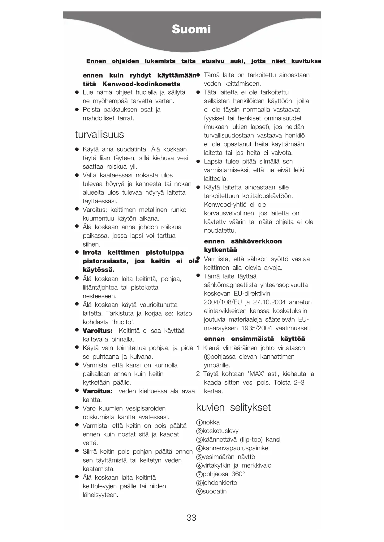 Tämä laite täyttää sähkömagneettista yhteensopivuutta koskevan EU-direktiivin 2004/108/EU ja 27.10.2004 annetun elintarvikkeiden kanssa kosketuksiin joutuvia materiaaleja säätelevän EU- määräyksen 1935/2004 vaatimukset. ennen ensimmäistä käyttöä 1 Kierrä ylimääräinen johto virtatason 햹 pohjassa olevan kannattimen ympärille. 2 Täytä kohtaan ’MAX’ asti, kiehauta ja kaada sitten vesi pois. Toista 2–3 kertaa. kuvien selitykset 햲 nokka 햳 kosketuslevy 햴 käännettävä (flip-top) kansi 햵 kannenvapautuspainike 햶 vesimäärän näyttö 햷 virtakytkin ja merkkivalo 햸 pohjaosa 360° 햹 johdonkierto 햺 suodatin Suomi