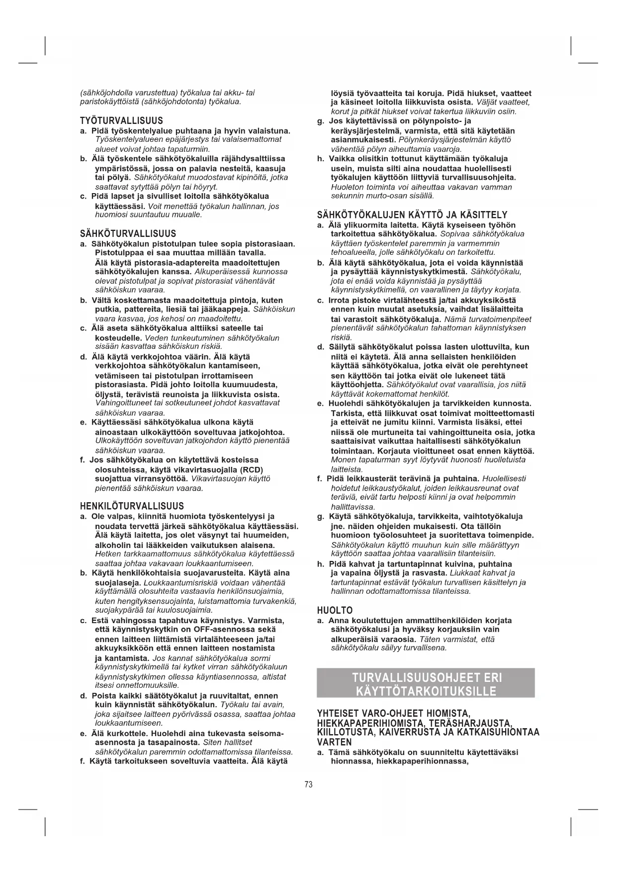 VAROITUS LUE KAIKKI TÄMÄN SÄHKÖTYÖKALUN KANSSA TOIMITETUT TURVALLISUUSOHJEET, KÄYTTÖOHJEET, KAAVIOT JA TEKNISET TIEDOT. Jos alla olevia ohjeita ei noudateta, seurauksena saattaa olla sähköisku, tulipalo ja/tai vakava loukkaantuminen. Säilytä kaikki ohjeet ja varoitukset myöhempää käyttöä varten. Termillä ”sähkötyökalu” tarkoitetaan sähkökäyttöistä 72(sähköjohdolla varustettua) työkalua tai akku- tai paristokäyttöistä (sähköjohdotonta) työkalua. TYÖTURVALLISUUS a. Pidä työskentelyalue puhtaana ja hyvin valaistuna. Työskentelyalueen epäjärjestys tai valaisemattomat alueet voivat johtaa tapaturmiin. b. Älä työskentele sähkötyökaluilla räjähdysalttiissa ympäristössä, jossa on palavia nesteitä, kaasuja tai pölyä. Sähkötyökalut muodostavat kipinöitä, jotka saattavat sytyttää pölyn tai höyryt. c. Pidä lapset ja sivulliset loitolla sähkötyökalua käyttäessäsi. Voit menettää työkalun hallinnan, jos huomiosi suuntautuu muualle.