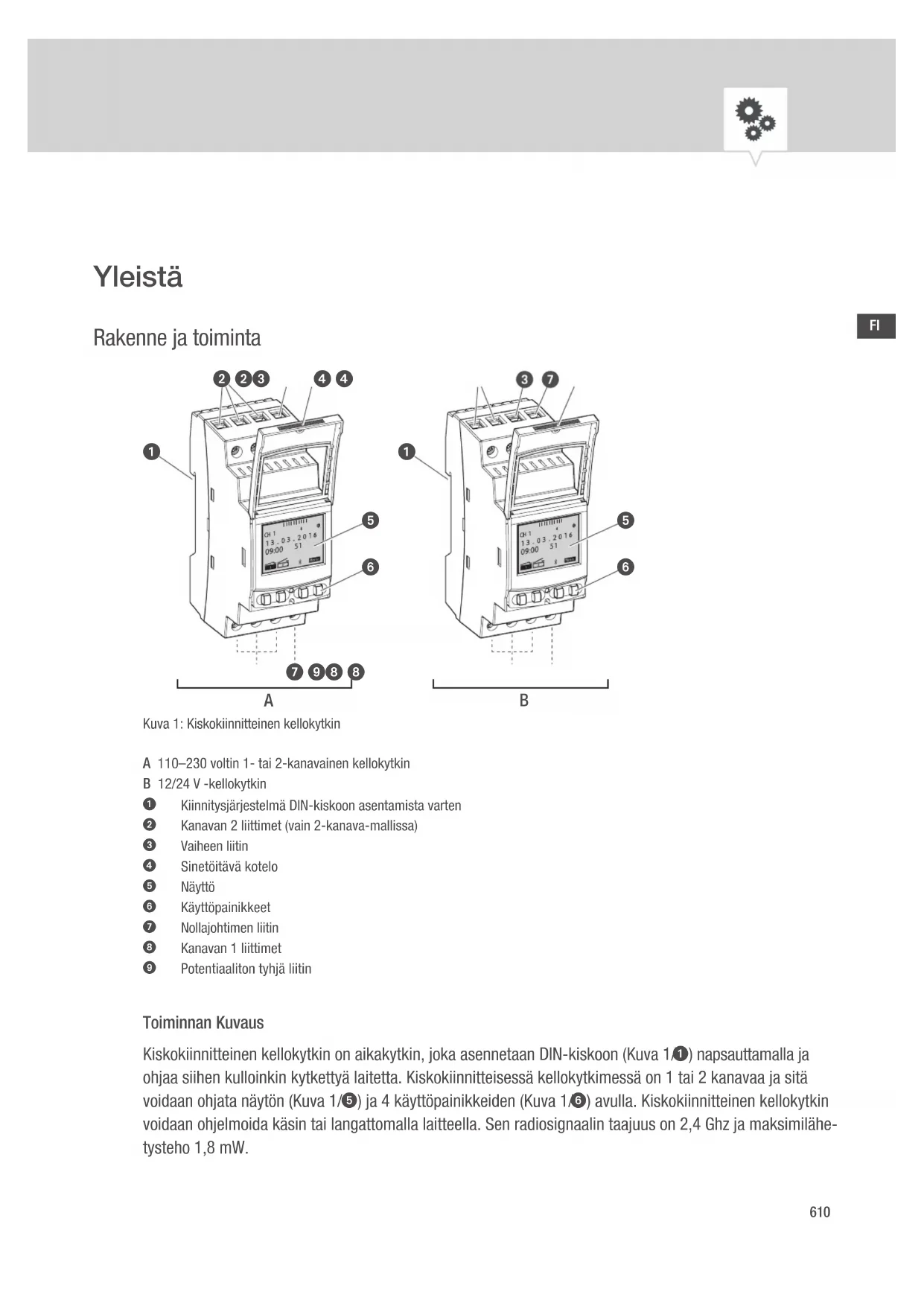 Yleistä Rakenne ja toiminta Kuva 1: Kiskokiinnitteinen kellokytkin A 110–230 voltin 1- tai 2-kanavainen kellokytkin B 12/24 V -kellokytkin