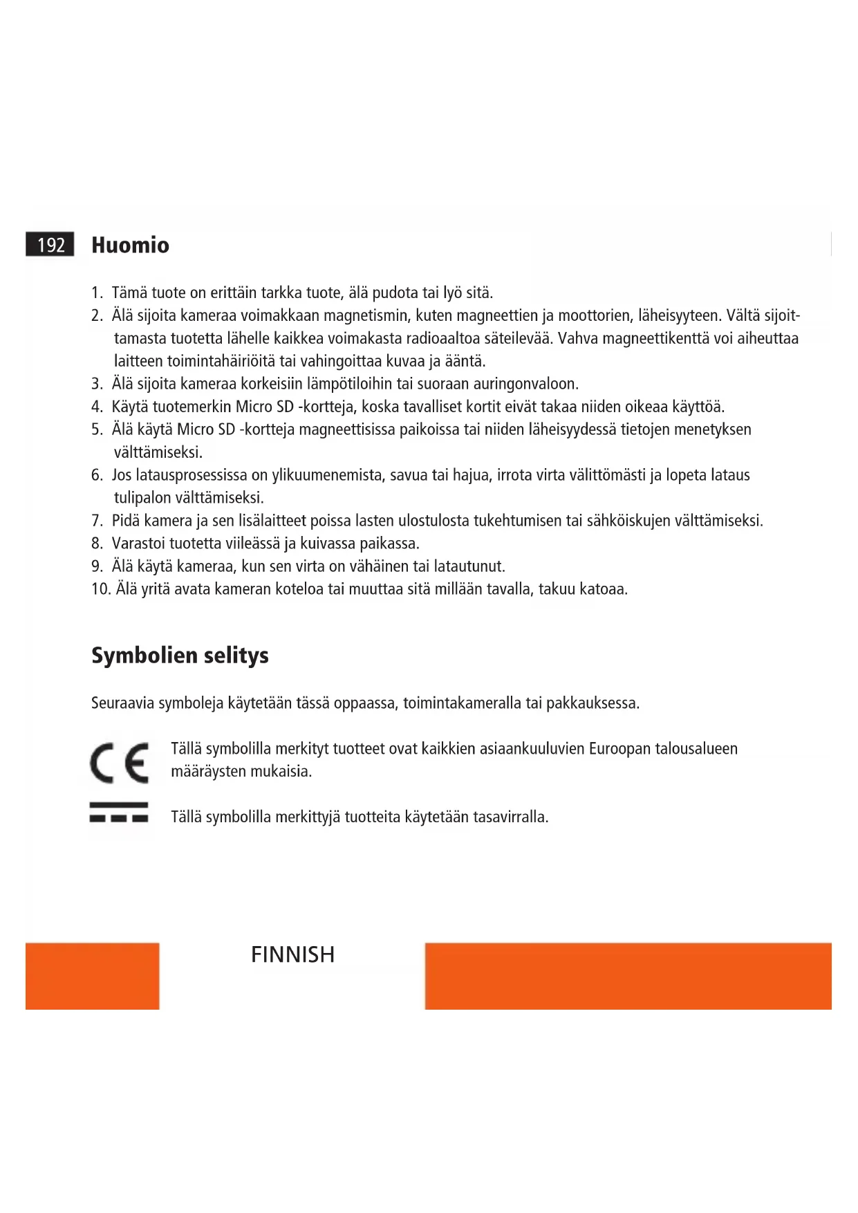 Symbolien selitys Seuraavia symboleja käytetään tässä oppaassa, toimintakameralla tai pakkauksessa. Tällä symbolilla merkityt tuotteet ovat kaikkien asiaankuuluvien Euroopan talousalueen määräysten mukaisia. Tällä symbolilla merkittyjä tuotteita käytetään tasavirralla.193 Tuotteen ominaisuudet Kuvasensori 1/3,06“, 13M resoluutio Stillkuvan resoluutio 20M (5120x3840) (interpoloitu), 16M (4640x3480) (interpoloitu), 14M (4320x3240) (interpoloitu), 10M (3648x2736), 8M (3264x2448), 5M (2592x1944), 2M (1600x1200) Videotarkkuus 4K (3840x2160/60/30fps), 2.7K (2704x1520/30fps), 1080P (1920x1080/60/30fps), 720P (1280x720/120/60fps) Videotila Normaali, aika kuluu, hidastettu, nopea, silmukka Valokuvatila Yksittäinen, sarjakuvaus, lähtölaskenta, aikaväli, pitkä valotus Lisätoiminnot Valkotasapaino vedenalaiselle, web-toiminto, elektroninen kuvanvakautus Linssi laajakulmalinssi aukko F = 2,8 | polttoväli f: 2,75 mm Näyttö 2“ kosketusnäyttö (näytön koko 5,08 cm) ja 1,33” selfie-näyttö Muistinpaikka jopa SDXC 64 Gt: n microSD-korteille Tietomuoto Still-kuva: JPG | Video: MOV Liittimet microUSB 2.0, microHDMI, ¼ ”jalustalanka WiFi iEEE 802.11 /b/g/n 2.4 GHz Kaukosäädin Mukana 2,4 GHz kaukosäädin Kotelo Vedenpitävä 10 m asti Akun kesto Enintään 85 minuuttia täysin ladatulla akulla (4K) Virta vaihdettava litium-ioniakku (1000 mAh / 3,7 Wh) Mitat | Paino 65,5 x 43,8 x 26,5 mm | ca. 129 g / 109 g (akulla tai ilman) Toimituksen sisältö Rollei Actioncam 8s Plus, vedenalainen suojakotelo jopa 40 m syvyyteen, 2,4 GHz: n kaukosäädin, vaihdettava akku, 8 kiinnikettä, kypäräkiinnitys, koukku ja silmukkikiinnitin, tarrat, johdinsiteet, metallikaapeli, USB-kaapeli ja linssikangas194 FINNISH Kameran kuvaus Fron/t/Selfie-näyttö Linssi Sisäänrakennettu kaiutin Mikro-HDMI-paikka Mikro-USB-paikka 1/4“ Jalustakiinnitys Akku & Micro SD -paikka Mode-painike (Paina 3 sekunnin ajan – vaihda näytölle) Sisäänrakennettu mikrofoni Suljin / valintapainike Virta / WiFi-painike Toiminnan ilmaisin Latausosoitin Kosketa Näyttö