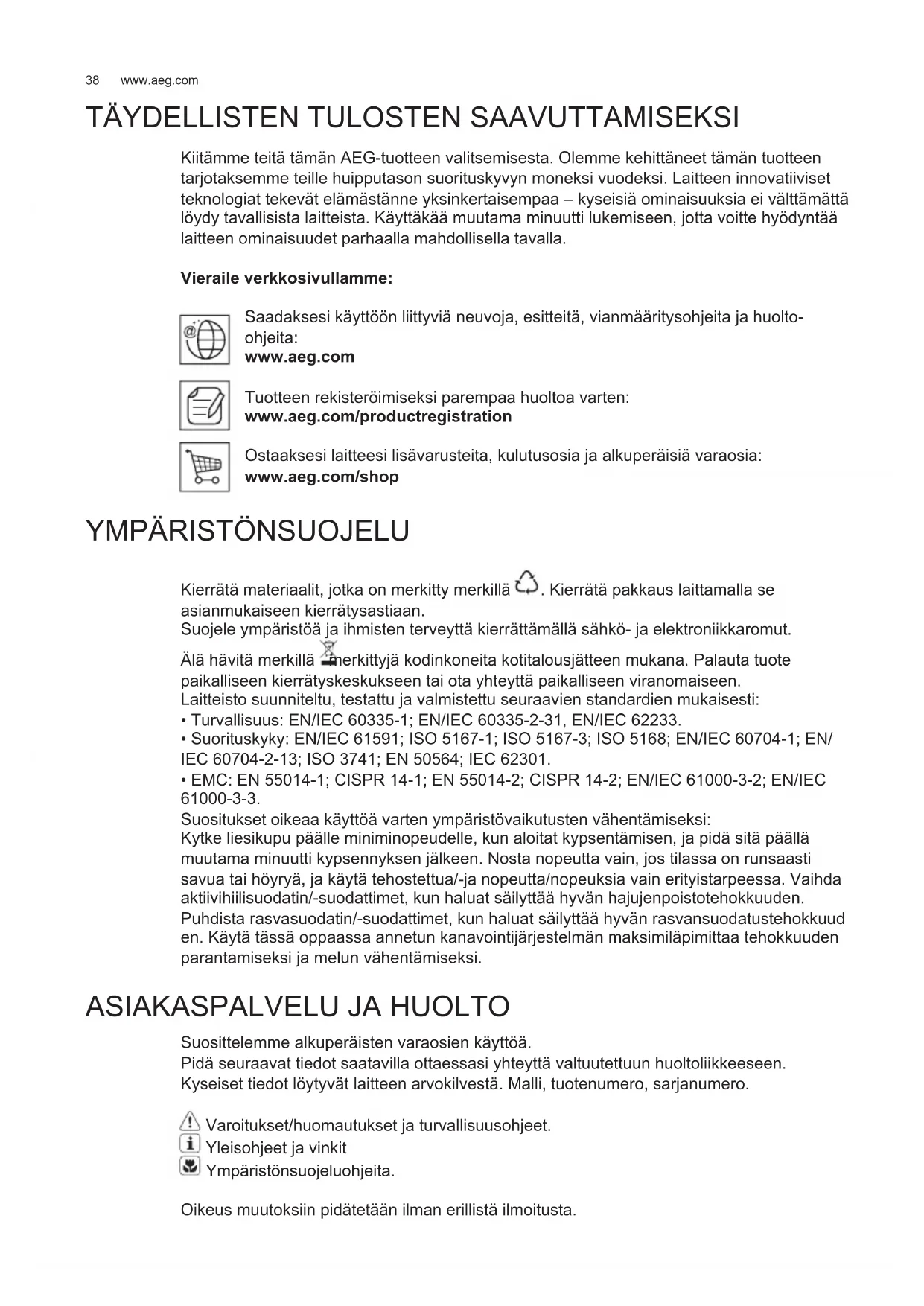 Kiitämme teitä tämän AEG-tuotteen valitsemisesta. Olemme kehittäneet tämän tuotteen tarjotaksemme teille huipputason suorituskyvyn moneksi vuodeksi. Laitteen innovatiiviset teknologiat tekevät elämästänne yksinkertaisempaa – kyseisiä ominaisuuksia ei välttämättä löydy tavallisista laitteista. Käyttäkää muutama minuutti lukemiseen, jotta voitte hyödyntää laitteen ominaisuudet parhaalla mahdollisella tavalla. Vieraile verkkosivullamme: Saadaksesi käyttöön liittyviä neuvoja, esitteitä, vianmääritysohjeita ja huolto- ohjeita: www.aeg.com Tuotteen rekisteröimiseksi parempaa huoltoa varten: www.aeg.com/productregistration Ostaaksesi laitteesi lisävarusteita, kulutusosia ja alkuperäisiä varaosia: www.aeg.com/shop