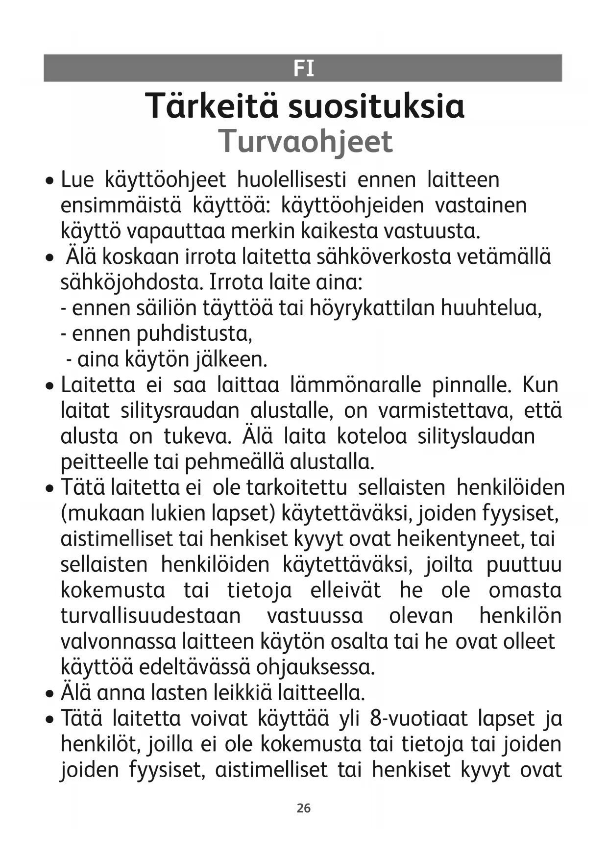 - Älä koskaan jätä laitetta ilman valvontaa: - kun laite on kytketty sähköverkkoon, - ennen kuin laite on jäähtynyt noin 1 tunnin.