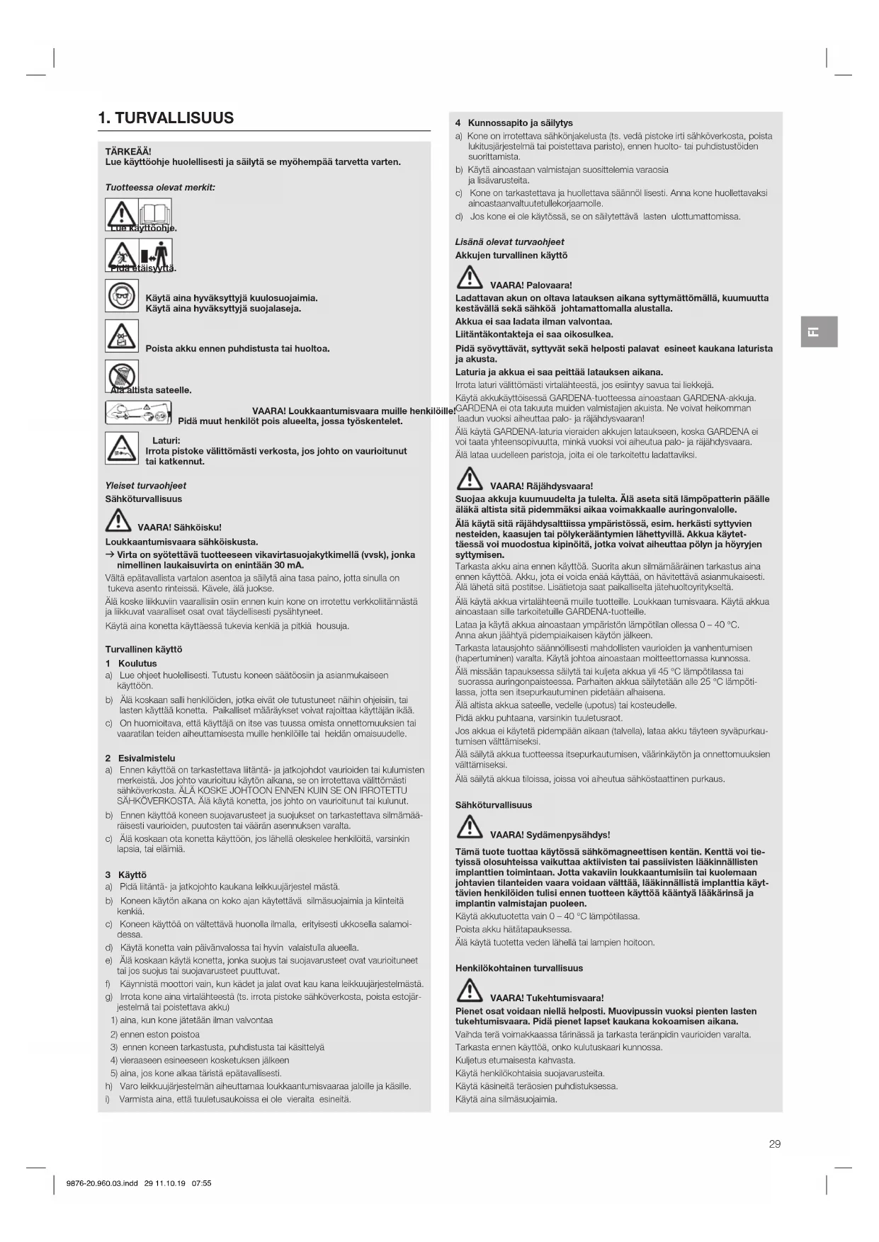 VAARA! Henkilövammat! Älä käytä tuotetta pensasaitojen leikkaamiseen, materiaalien silp- puamiseen tai kompostoimiseen. 9876-20.960.03.indd 28 11.10.19 07:55FI