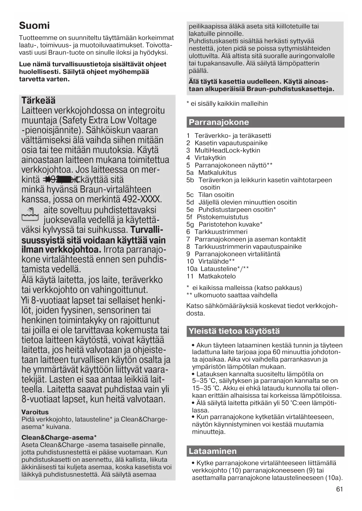 Ökad åtgång av rengöringsvätska. Avloppet på Clean & Charge-stati- onen är igentäppt. – Rengör dränaget med en tandpetare av trä. – Torka rent behållaren regelbundet. Garanti Vi garanterar denna produkt för två år från och med inköpsdatum. Under garantitiden kommer vi utan kostnad, att avhjälpa alla brister i apparaten som är hänförbara till fel i material eller utförande, genom att antingen reparera eller byta ut hela apparaten efter eget gottfinnande. Denna garanti gäller i alla länder där denna apparat levereras av Braun eller deras auktoriserade återförsäljare. Denna garanti gäller inte: skada på grund av felaktig användning, normalt slitage (t.ex. skärblad och saxhuvud) eller skador som har en försumbar effekt på värdet eller apparatens funktion. Garantin upphör att gälla om reparationer utförs av icke behörig person eller om Brauns originaldelar inte används. För att erhålla service under garantitiden skall den kompletta apparaten lämnas in tillsammans med inköpskvittot, till ett auktoriserat Braun verkstad: www.service.braun.com. Ring 020-21 33 21 för information om närmaste Braun verkstad. 91611492_93XXcc_W&D_MN_Type_5793_S6-76.indd 6091611492_93XXcc_W&D_MN_Type_5793_S6-76.indd 60 20.10.17 08:1620.10.17 08:16 CSS APPROVED Effective Date 23Oct2017 GMT - Printed 22Nov2017 Page 60 of 7661 Suomi Tuotteemme on suunniteltu täyttämään korkeimmat laatu-, toimivuus- ja muotoiluvaatimukset. Toivotta- vasti uusi Braun-tuote on sinulle iloksi ja hyödyksi. Lue nämä turvallisuustietoja sisältävät ohjeet huolellisesti. Säilytä ohjeet myöhempää tarvetta varten. Tärkeää Laitteen verkkojohdossa on integroitu muuntaja (Safety Extra Low Voltage -pienoisjännite). Sähköiskun vaaran välttämiseksi älä vaihda siihen mitään osia tai tee mitään muutoksia. Käytä ainoastaan laitteen mukana toimitettua verkkojohtoa. Jos laitteessa on mer- kintä 492, voit käyttää sitä minkä hyvänsä Braun-virtalähteen kanssa, jossa on merkintä 492-XXXX. aite soveltuu puhdistettavaksi juoksevalla vedellä ja käytettä- väksi kylvyssä tai suihkussa. Turvalli- suussyistä sitä voidaan käyttää vain ilman verkkojohtoa. Irrota parranajo- kone virtalähteestä ennen sen puhdis- tamista vedellä. Älä käytä laitetta, jos laite, teräverkko tai verkkojohto on vahingoittunut. Yli 8-vuotiaat lapset tai sellaiset henki- löt, joiden fyysinen, sensorinen tai henkinen toimintakyky on rajoittunut tai joilla ei ole tarvittavaa kokemusta tai tietoa laitteen käytöstä, voivat käyttää laitetta, jos heitä valvotaan ja ohjeiste- taan laitteen turvallisen käytön osalta ja he ymmärtävät käyttöön liittyvät vaara- tekijät. Lasten ei saa antaa leikkiä lait- teella. Laitetta saavat puhdistaa vain yli 8-vuotiaat lapset, kun heitä valvotaan. Varoitus Pidä verkkojohto, latausteline* ja Clean&Charge- asema* kuivana. Clean&Charge-asema* Aseta Clean&Charge -asema tasaiselle pinnalle, jotta puhdistusnestettä ei pääse vuotamaan. Kun puhdistuskasetti on asennettu, älä kallista, liikuta äkkinäisesti tai kuljeta asemaa, koska kasetista voi läikkyä puhdistusnestettä. Älä säilytä asemaa peilikaapissa äläkä aseta sitä kiillotetuille tai lakatuille pinnoille. Puhdistuskasetti sisältää herkästi syttyvää nestettä, joten pidä se poissa syttymislähteiden ulottuvilta. Älä altista sitä suoralle auringonvalolle tai tupakansavulle. Älä säilytä lämpöpatterin päällä. Älä täytä kasettia uudelleen. Käytä ainoas- taan alkuperäisiä Braun-puhdistuskasetteja.