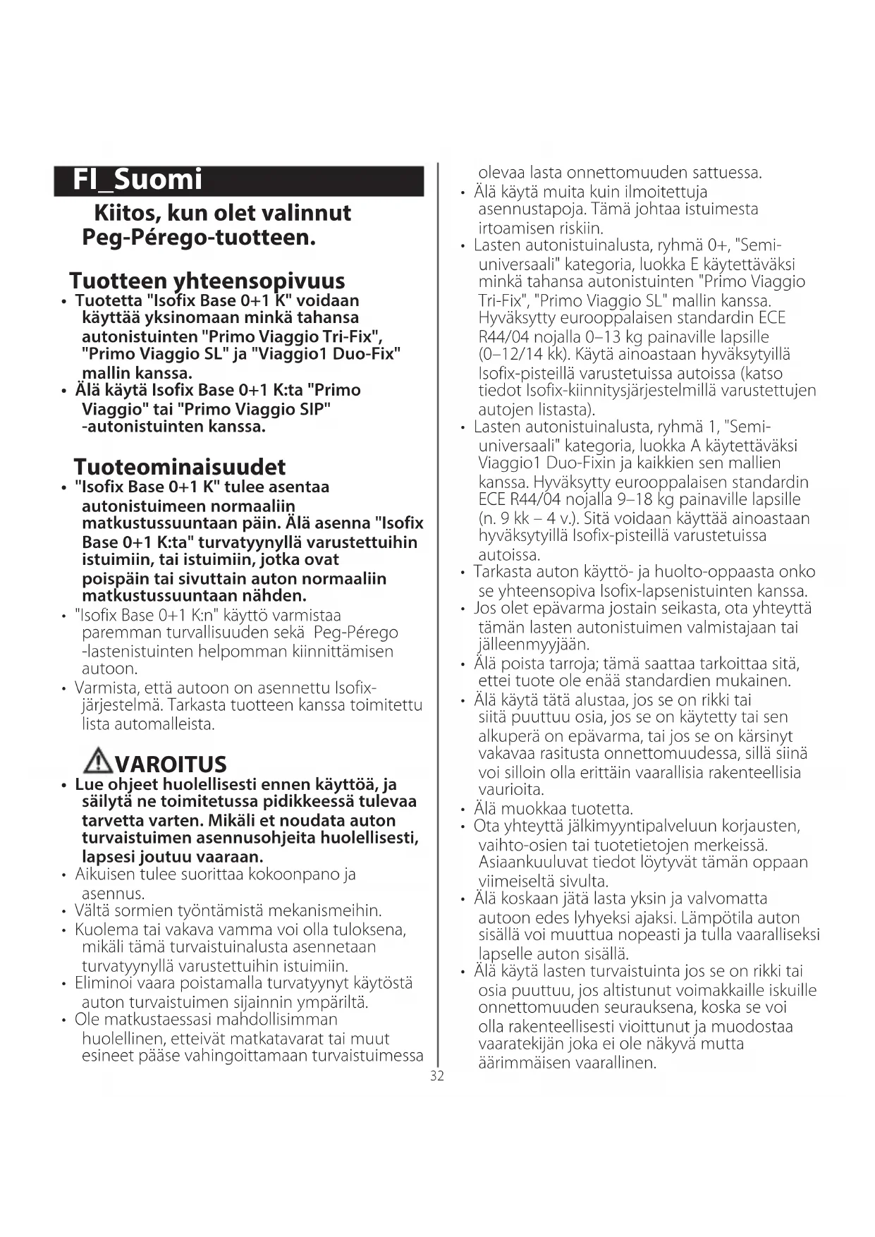 - Tuotetta "Isofix Base 0+1 K" voidaan käyttää yksinomaan minkä tahansa autonistuinten "Primo Viaggio Tri-Fix", "Primo Viaggio SL" ja "Viaggio1 Duo-Fix" mallin kanssa.