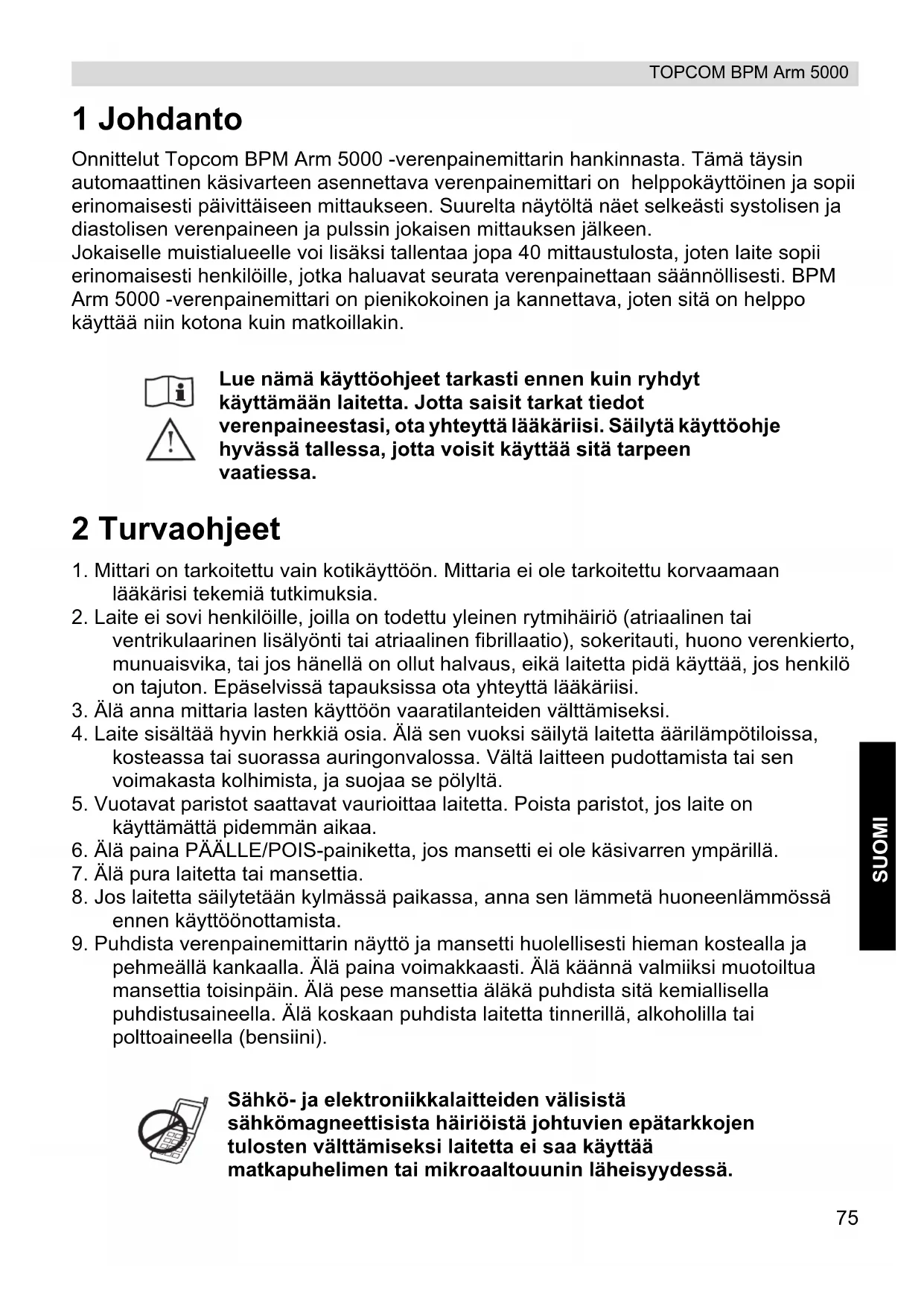 pehmeällä kankaalla. Älä paina voimakkaasti. Älä käännä valmiiksi muotoiltua mansettia toisinpäin. Älä pese mansettia äläkä puhdista sitä kemiallisella puhdistusaineella. Älä koskaan puhdista laitetta tinnerillä, alkoholilla tai polttoaineella (bensiini). Lue nämä käyttöohjeet tarkasti ennen kuin ryhdyt käyttämään laitetta. Jotta saisit tarkat tiedot verenpaineestasi, ota yhteyttä lääkäriisi. Säilytä käyttöohje hyvässä tallessa, jotta voisit käyttää sitä tarpeen vaatiessa. Sähkö- ja elektroniikkalaitteiden välisistä sähkömagneettisista häiriöistä johtuvien epätarkkojen tulosten välttämiseksi laitetta ei saa käyttää matkapuhelimen tai mikroaaltouunin läheisyydessä.76 TOPCOM BPM Arm 5000 3 Verenpaine