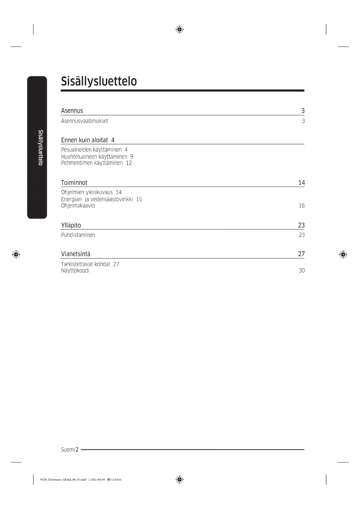 - (opłata według taryfy operatora) http://www.samsung.com/pl/support/ HUNGARY 0680SAMSUNG (0680-726-7864) www.samsung.com/hu/support CROATIA 072 726 786 www.samsung.com/hr/support ALBANIA 045 620 202 www.samsung.com/al/support North Macedonia 023 207 777 www.samsung.com/mk/support SLOVENIA 080 697 267 (brezplačna številka) www.samsung.com/si/support BOSNIA 055 233 999 www.samsung.com/ba/support ESTONIA 800-7267 www.samsung.com/ee/support LITHUANIA 8-800-77777 www.samsung.com/lt/support LATVIA 8000-7267 www.samsung.com/lv/support WEB_Dishwaser_Global_00_NO.indd 32 2021-04-09 12:02:11Astianpesukone Ekosuunnitteluopas WEB_Dishwaser_Global_00_FI.indd 1 2021-04-09 12:03:41Suomi2 Sisällysluettelo Sisällysluettelo Asennus 3 Asennusvaatimukset 3 Ennen kuin aloitat 4 Pesuaineiden käyttäminen 4 Huuhteluaineen käyttäminen 9 Pehmentimen käyttäminen 12 Toiminnot 14 Ohjelmien yleiskuvaus 14 Energian- ja vedensäästövinkki 15 Ohjelmakaavio 16 Ylläpito 23 Puhdistaminen 23 Vianetsintä 27 Tarkistettavat kohdat 27 Näyttökoodi 30 WEB_Dishwaser_Global_00_FI.indd 2 2021-04-09 12:03:41Suomi 3 Asennus Asennus Asennusvaatimukset Jotta tulipaloilta, sähköiskuilta ja henkilövahingoilta voitaisiin välttyä, kaikki johdotus- ja maadoitustyöt on annettava pätevän teknikon tehtäväksi. Virransyöttö