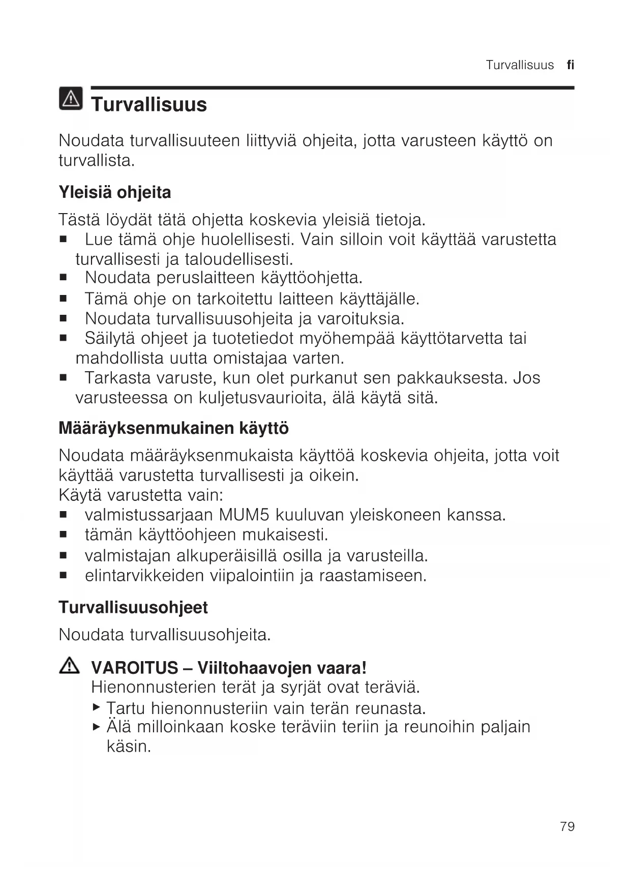 Turvallisuus Noudata turvallisuuteen liittyviä ohjeita, jotta varusteen käyttö on turvallista. Yleisiä ohjeita Tästä löydät tätä ohjetta koskevia yleisiä tietoja. ¡ Lue tämä ohje huolellisesti. Vain silloin voit käyttää varustetta turvallisesti ja taloudellisesti. ¡ Noudata peruslaitteen käyttöohjetta. ¡ Tämä ohje on tarkoitettu laitteen käyttäjälle. ¡ Noudata turvallisuusohjeita ja varoituksia. ¡ Säilytä ohjeet ja tuotetiedot myöhempää käyttötarvetta tai mahdollista uutta omistajaa varten. ¡ Tarkasta varuste, kun olet purkanut sen pakkauksesta. Jos varusteessa on kuljetusvaurioita, älä käytä sitä. Määräyksenmukainen käyttö Noudata määräyksenmukaista käyttöä koskevia ohjeita, jotta voit käyttää varustetta turvallisesti ja oikein. Käytä varustetta vain: ¡ valmistussarjaan MUM5 kuuluvan yleiskoneen kanssa. ¡ tämän käyttöohjeen mukaisesti. ¡ valmistajan alkuperäisillä osilla ja varusteilla. ¡ elintarvikkeiden viipalointiin ja raastamiseen. Turvallisuusohjeet Noudata turvallisuusohjeita. VAROITUS‒Viiltohaavojen vaara! Hienonnusterien terät ja syrjät ovat teräviä.