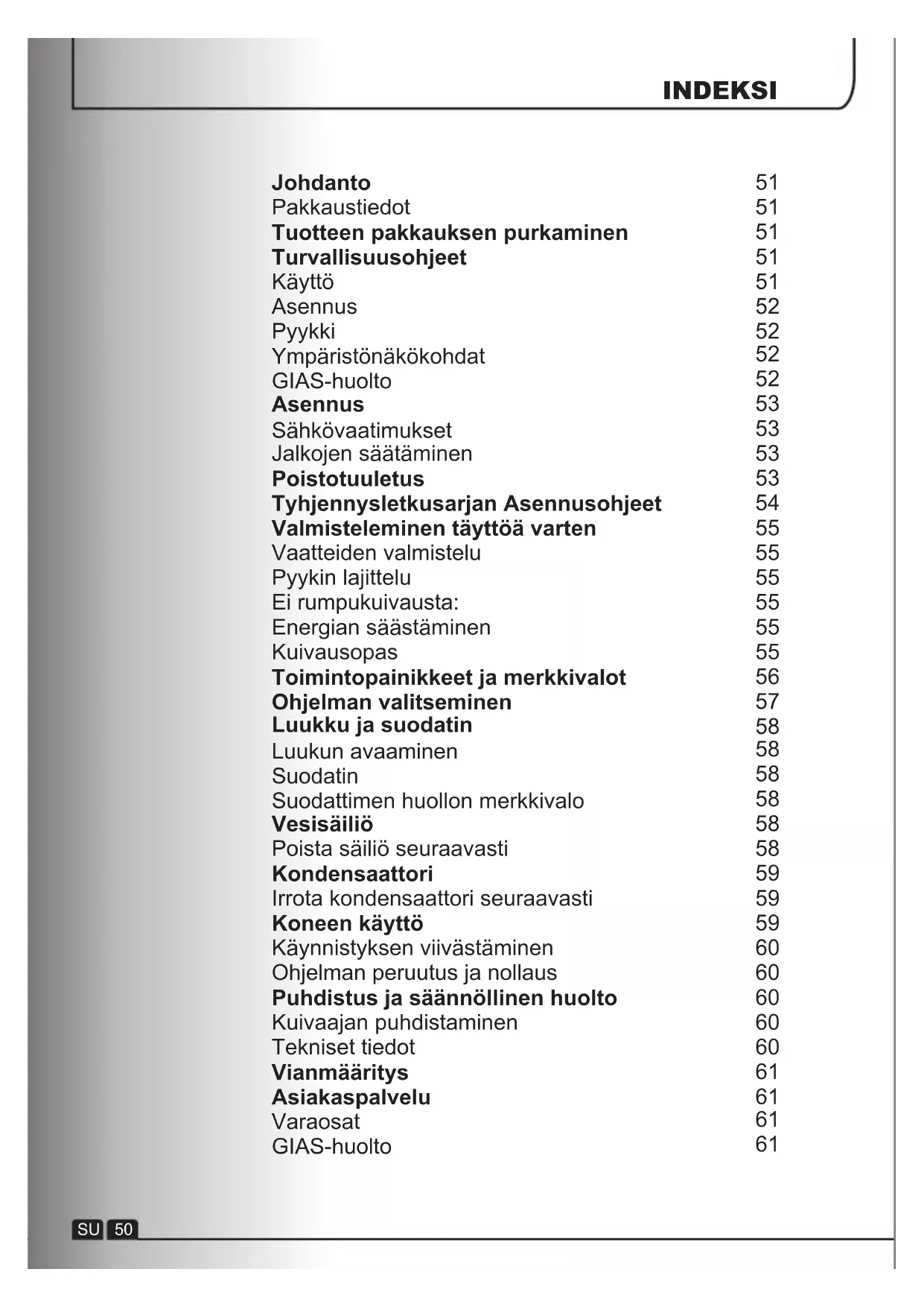 VIANMÄÄRITYS Mikä On Vikana... Viat, jotka voit korjata itse Ennen kuin otat yhteyttä GIAS-huoltoon, suorita seuraavat tarkistukset. Työstä veloitetaan, jos kone toimii kunnolla, se on asennettu väärin tai jos sitä on käytetty ohjeiden vastaisesti. Jos ongelma ei ratkea suositeltujen tarkistusten jälkeen, soita GIAS- huoltoon. Sieltä voi saada puhelimitse apua ongelman ratkaisemiseen. Näytössä näkyvä jäljellä oleva kuivausaika saattaa muuttua kuivauksen aikana. Elektroninen ohjaus tarkistaa jatkuvasti kuivausjakson aikana kuivausaikaa ja arvioi jäljellä olevan ajan. Jäljellä oleva kuivausaika saattaa joko lisääntyä tai vähentyä kuivausjakson aikana, tämä on täysin normaalia. Kuivausaika on liian pitkä/vaatteet eivät ole tarpeeksi kuivia… ● Oletko valinnut oikean kuivausajan/ ohjelman? ● Olivatko vaatteet liian märkiä? Väännettiinkö vesi kunnolla pois vaatteista tai lingottiinko ne? ● Tarvitseeko suodatin puhdistusta? ● Tarvitseeko kondensaattori puhdistusta? ● Onko kuivaimessa liikaa vaatteita? ● Onko ilmanotto- ja poistoaukoissa tai kuivaa- jan pohjassa esteitä? ● Onko -vaihtoehto valittuna edellisen kuiva-usjakson perusteella? Kuivain ei käynnisty… ● Toimiiko virransyöttö kuivaimeen? Kokeile pistorasian toimivuus toisella sähkökojeella, kuten lampulla. ●Onko pistoke oikein kytketty pistorasiaan? ●Onko sähkökatkos? ● Onko sulake palanut? ● Onko luukku kokonaan suljettu? ● Onko kuivain kytketty päälle sekä virrans- yötöstä että koneesta? ● Onko kuivausaika tai ohjelma valittu? ● Onko kone kytketty uudestaan päälle, sen jälkeen, kun luukku avattiin? ● Onko kuivaajan toiminta pysähtynyt, koska vesiastia on täynnä ja se pitää tyhjentää? Asiakaspalvelu Varaosat GIAS-Huolto Jos kuivaimessa on vieläkin ongelma, vaikka olet suorittanut kaikki suosittelemamme tarkistukset, soita GIAS-huoltoon ja kysy lisäohjeita. He saattavat pystyä selvittämään ongelman puhelimitse, tai sitten he järjestävät sopivan ajan, jolloin huoltoteknikko hoitaa asian takuuehtojen mukaisesti. Laskutus hoidetaan kuitenkin normaalisti, jos joku seuraavista kohdista pätee sinun koneeseesi: ● Koneen todetaan olevan toimintakunnossa. ● Konetta ei ole asennettu asennusohjeiden mukaisesti. ● Konetta on käytetty väärin. Käytä aina alkuperäisiä varaosia, joita saa suoraan GIAS-huollosta. Kuivain on meluisa… ● Sammuta kuivaimen virta ja kysy ohjeita GIAS- huollosta. -merkkivalo palaa… ● Tarvitseeko suodatin puhdistusta? ● Tarvitseeko kondensaattori puhdistusta? -merkkivalo palaa… ● Tarvitseeko vesisäiliö tyhjentää? Jos kone tarvitsee huoltoa tai korjausta, soita paikallisen GIAS-huollon huoltoteknikolle. Valmistaja ei ota mitään vastuuta tässä käyttöohjeessa mahdollisesti esiintyvistä painovirheistä. Valmistaja myös pidättää itsellään oikeuden tehdä asiaankuuluvia muutoksia tuotteisiinsa muuttamatta kuitenkaan niiden perusominaisuuksia.Introduzione Informazioni Sulla Consegna Estrazione Del Prodotto Dall’imballaggio Consigli di Sicurezza Utilizzo Installazione La Biancheria Tutela Dell’ambiente Servizio Gias Installazione Requisiti Elettrici Regolazione dei Piedini Ventilazione Kit i Montaggio Tubo i Scarico: Istruzioni Per il Montaggio Preparazione della Biancheria Preparazione dei Capi Evitare di Asciugare Risparmio Energia Selezione della Biancheria Guida Ad una Corretta Asciugatura Comandi e Spie Di Segnalazione Selezione del Programma Portellone e Filtro Apertura del Portellone Filtro Spia di Pulizia Filtro Vaschetta Dell’acqua Per Togliere La Vaschetta Condensatore Per Togliere Il Condensatore Funzionamento Partenza Ritardata Annullamento e Azzeramento del Programma Pulizia e Manutenzione Ordinaria Pulizia Dell’asciugatrice Specifiche Tecniche Ricerca Guasti Servizio Assistenza Clienti Ricambi Servizio Assistenza Gias d d INDICE