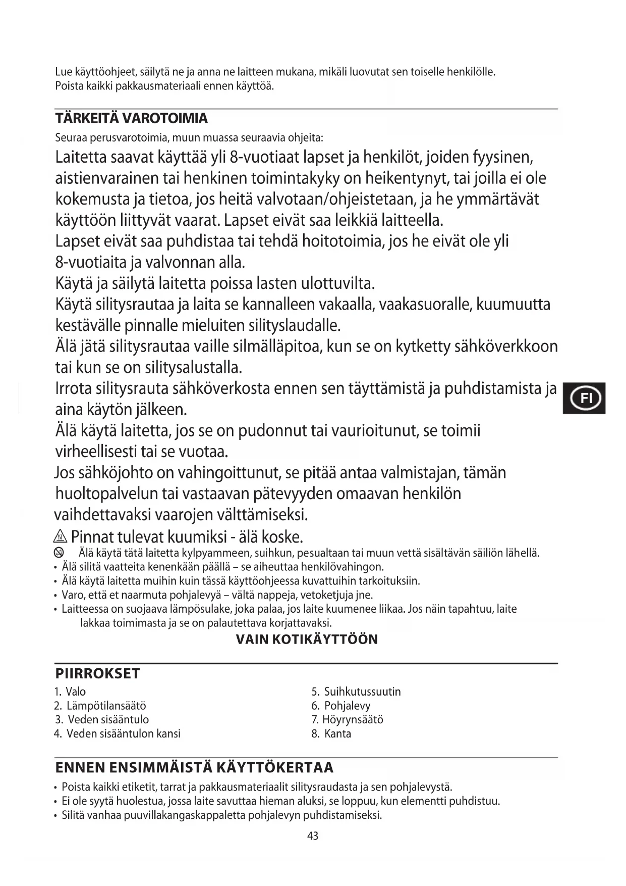 Seuraa perusvarotoimia, muun muassa seuraavia ohjeita: Laitetta saavat käyttää yli 8-vuotiaat lapset ja henkilöt, joiden fyysinen, aistienvarainen tai henkinen toimintakyky on heikentynyt, tai joilla ei ole kokemusta ja tietoa, jos heitä valvotaan/ohjeistetaan, ja he ymmärtävät käyttöön liittyvät vaarat. Lapset eivät saa leikkiä laitteella. Lapset eivät saa puhdistaa tai tehdä hoitotoimia, jos he eivät ole yli 8-vuotiaita ja valvonnan alla. Käytä ja säilytä laitetta poissa lasten ulottuvilta. Käytä silitysrautaa ja laita se kannalleen vakaalla, vaakasuoralle, kuumuutta kestävälle pinnalle mieluiten silityslaudalle. Älä jätä silitysrautaa vaille silmälläpitoa, kun se on kytketty sähköverkkoon tai kun se on silitysalustalla. Irrota silitysrauta sähköverkosta ennen sen täyttämistä ja puhdistamista ja aina käytön jälkeen. Älä käytä laitetta, jos se on pudonnut tai vaurioitunut, se toimii virheellisesti tai se vuotaa. Jos sähköjohto on vahingoittunut, se pitää antaa valmistajan, tämän huoltopalvelun tai vastaavan pätevyyden omaavan henkilön vaihdettavaksi vaarojen välttämiseksi. h Pinnat tulevat kuumiksi - älä koske. b Älä käytä tätä laitetta kylpyammeen, suihkun, pesualtaan tai muun vettä sisältävän säiliön lähellä.