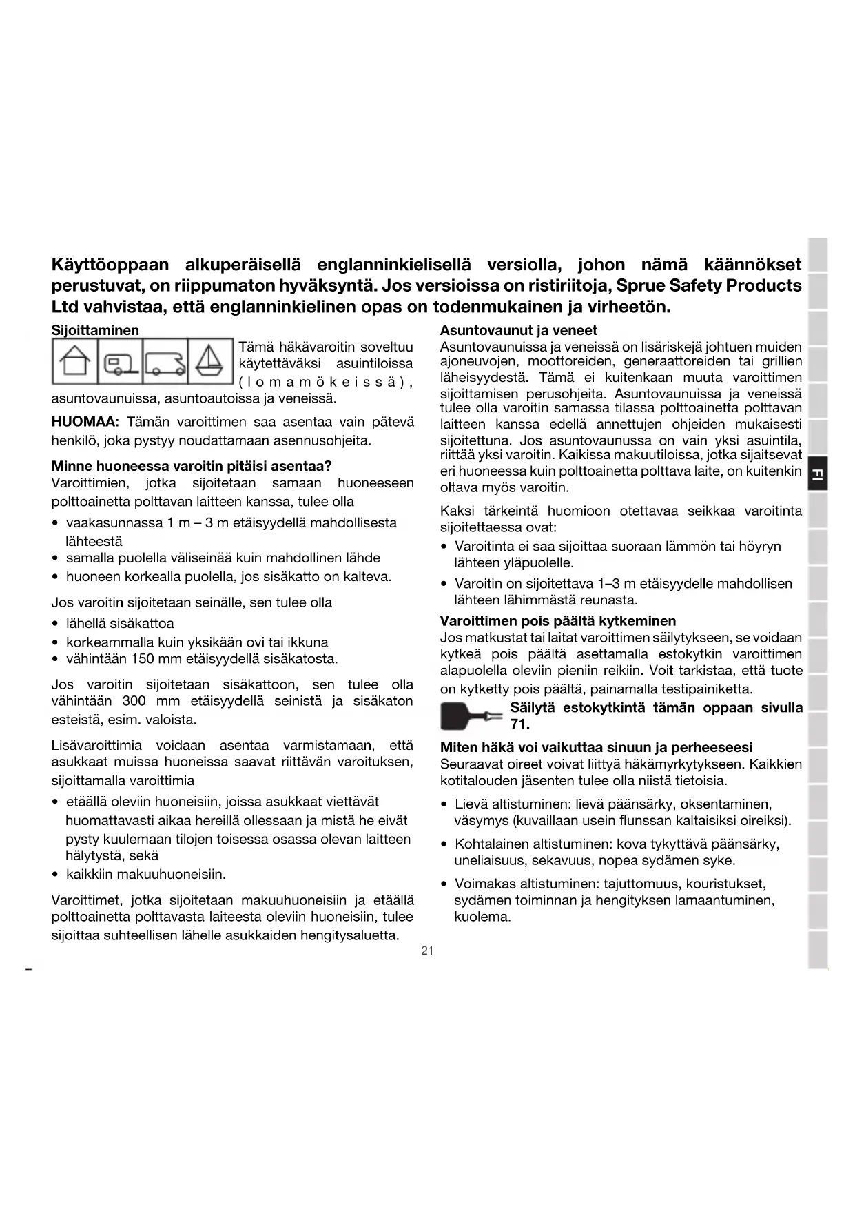 - Voimakas altistuminen: tajuttomuus, kouristukset, sydämen toiminnan ja hengityksen lamaantuminen, kuolema. Käyttöoppaan alkuperäisellä englanninkielisellä versiolla, johon nämä käännökset perustuvat, on riippumaton hyväksyntä. Jos versioissa on ristiriitoja, Sprue Safety Products Ltd vahvistaa, että englanninkielinen opas on todenmukainen ja virheetön.FI