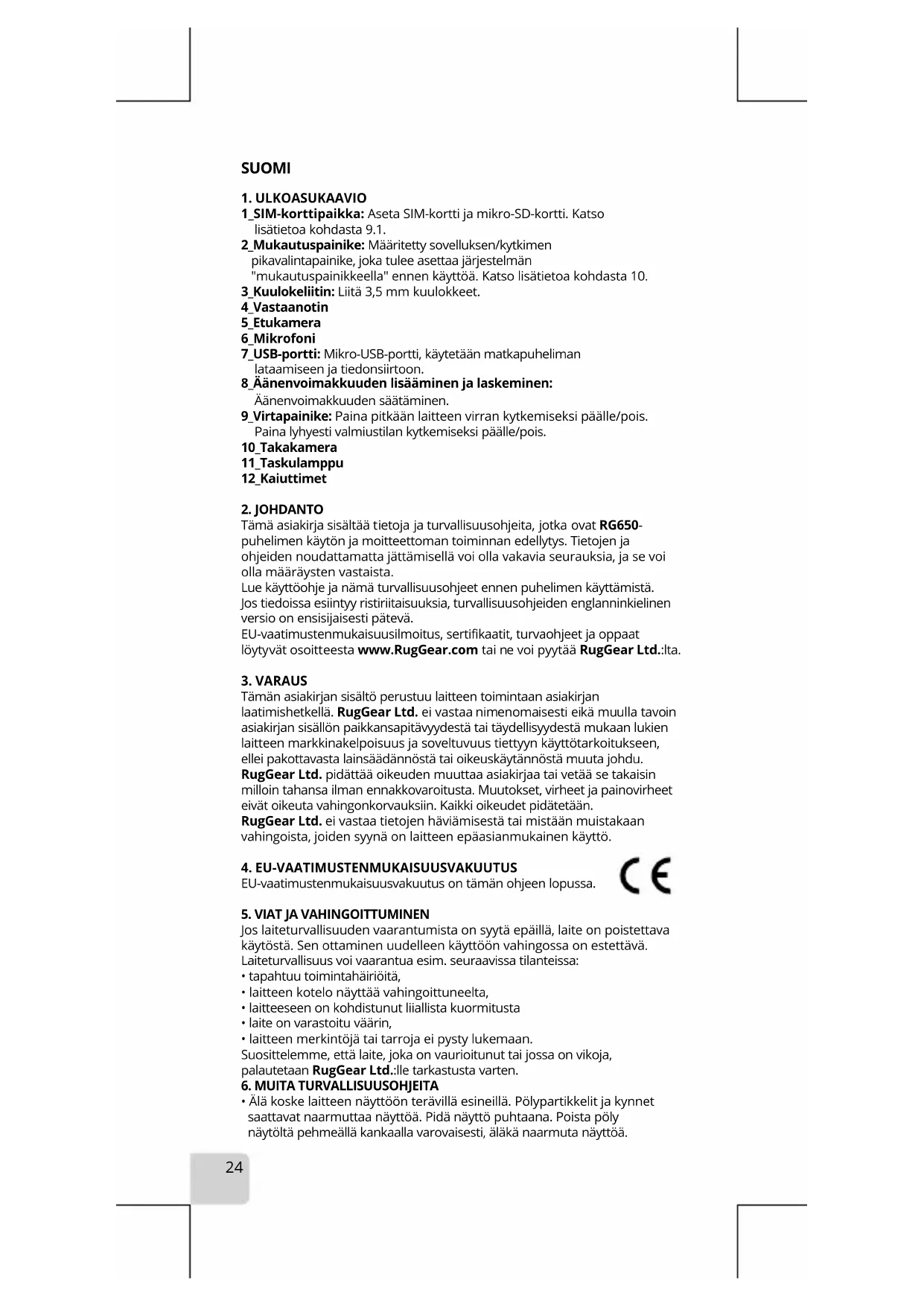Tämä asiakirja sisältää tietoja ja turvallisuusohjeita, jotka ovat RG650- puhelimen käytön ja moitteettoman toiminnan edellytys. Tietojen ja ohjeiden noudattamatta jättämisellä voi olla vakavia seurauksia, ja se voi olla määräysten vastaista. Lue käyttöohje ja nämä turvallisuusohjeet ennen puhelimen käyttämistä. Jos tiedoissa esiintyy ristiriitaisuuksia, turvallisuusohjeiden englanninkielinen versio on ensisijaisesti pätevä. EU-vaatimustenmukaisuusilmoitus, sertifikaatit, turvaohjeet ja oppaat löytyvät osoitteesta www.RugGear.com tai ne voi pyytää RugGear Ltd.:lta.