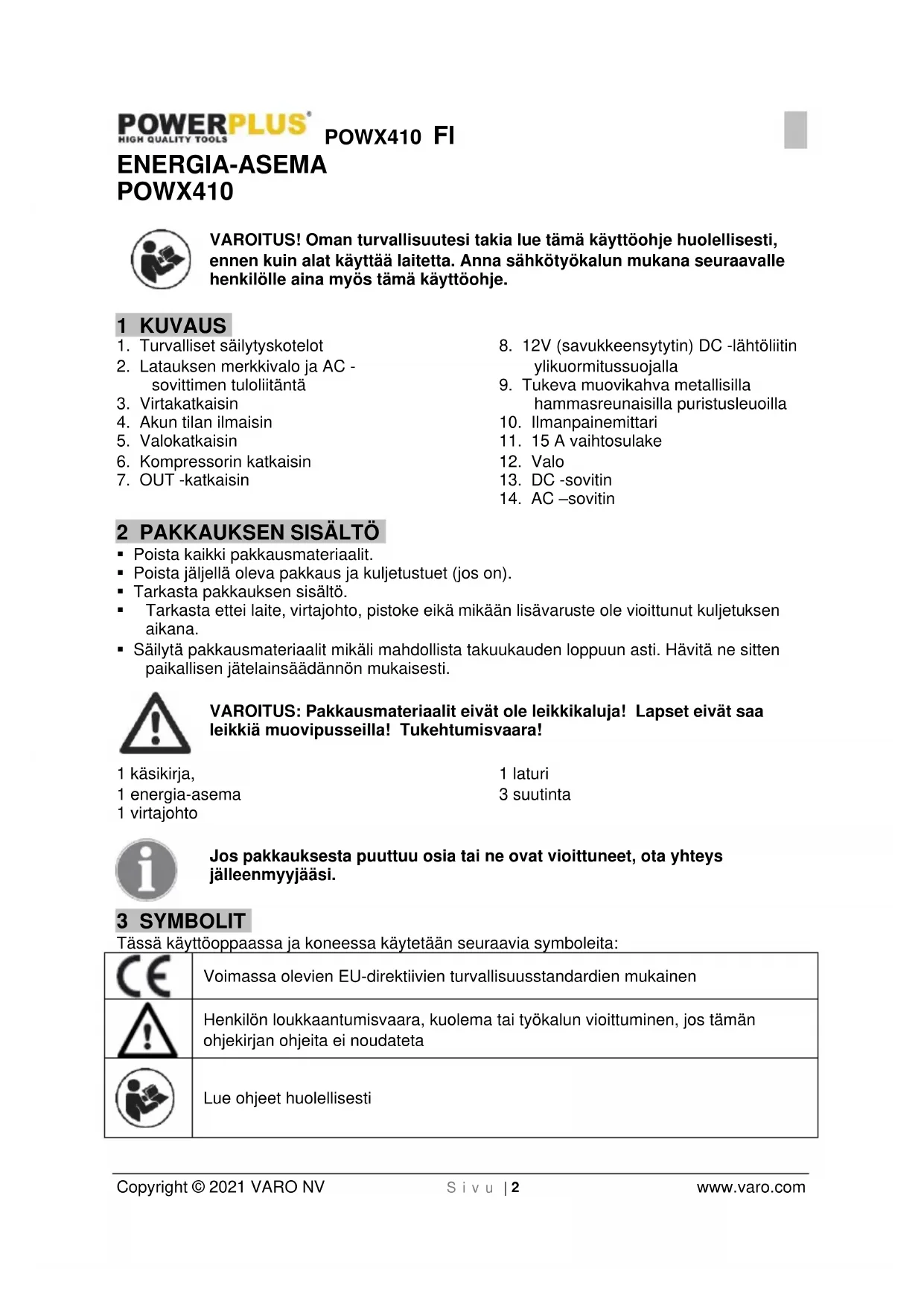 Copyright © 2021 VARO NV S i v u | 2 www.varo.com ENERGIA-ASEMA POWX410 VAROITUS! Oman turvallisuutesi takia lue tämä käyttöohje huolellisesti, ennen kuin alat käyttää laitetta. Anna sähkötyökalun mukana seuraavalle henkilölle aina myös tämä käyttöohje. 1 KUVAUS