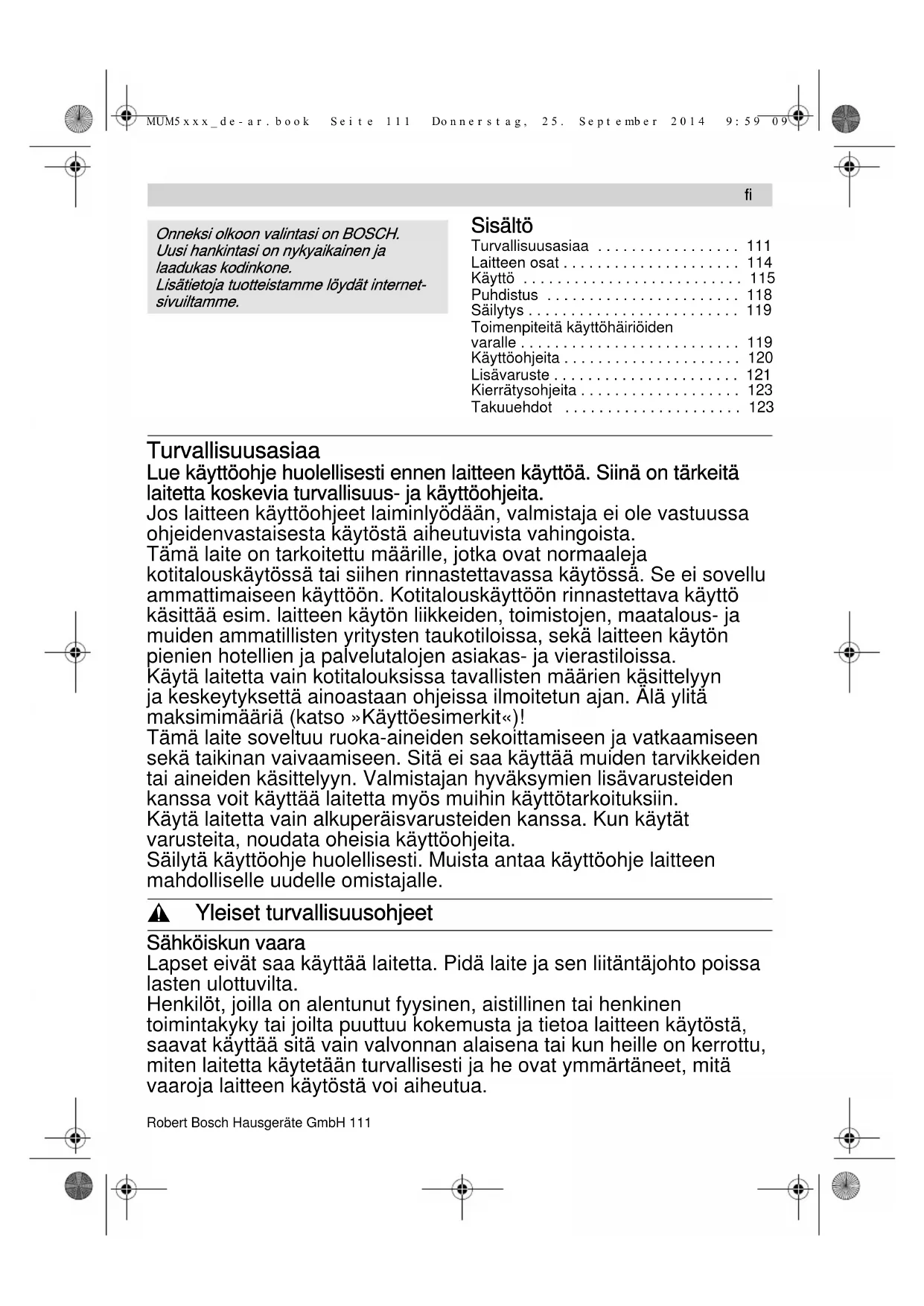 - Rätten till ändringar förbehålles. MUM5xxx_de-ar.book Seite 110 Donnerstag, 25. September 2014 9:59 09111Robert Bosch Hausgeräte GmbH 111 Нisältö Turvallisuusasiaa p. 111