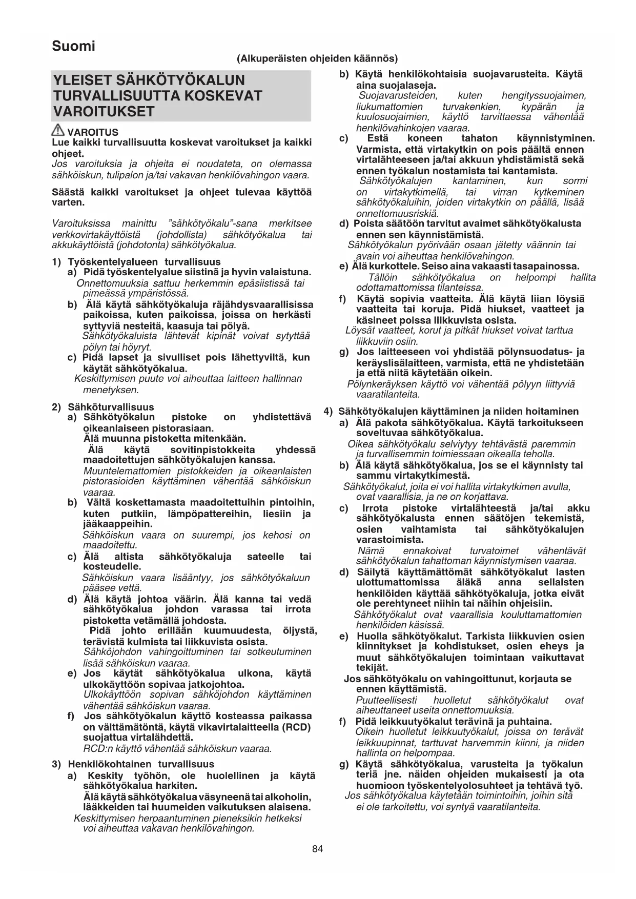 TURVALLISUUTTA KOSKEVAT VAROITUKSET VAROITUS Lue kaikki turvallisuutta koskevat varoitukset ja kaikki ohjeet. Jos varoituksia ja ohjeita ei noudateta, on olemassa sähköiskun, tulipalon ja/tai vakavan henkilövahingon vaara. Säästä kaikki varoitukset ja ohjeet tulevaa käyttöä varten. Varoituksissa mainittu ”sähkötyökalu”-sana merkitsee verkkovirtakäyttöistä (johdollista) sähkötyökalua tai akkukäyttöistä (johdotonta) sähkötyökalua.
