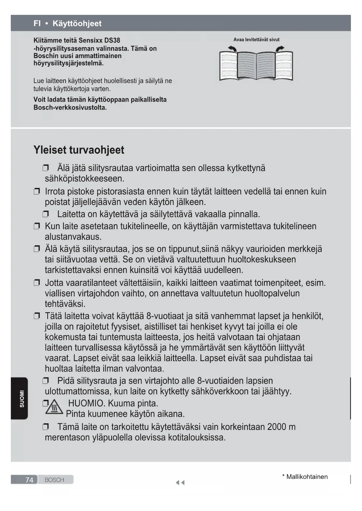 HUOMIO. Kuuma pinta. Pinta kuumenee käytön aikana. ❐ Tämä laite on tarkoitettu käytettäväksi vain korkeintaan 2000 m merentason yläpuolella olevissa kotitalouksissa. Kiitämme teitä Sensixx DS38 -höyrysilitysaseman valinnasta. Tämä on Boschin uusi ammattimainen höyrysilitysjärjestelmä. Lue laitteen käyttöohjeet huolellisesti ja säilytä ne tulevia käyttökertoja varten. Voit ladata tämän käyttöoppaan paikalliselta Bosch-verkkosivustolta. FI • Käyttöohjeet Avaa levitettävät sivut75 B O S C H