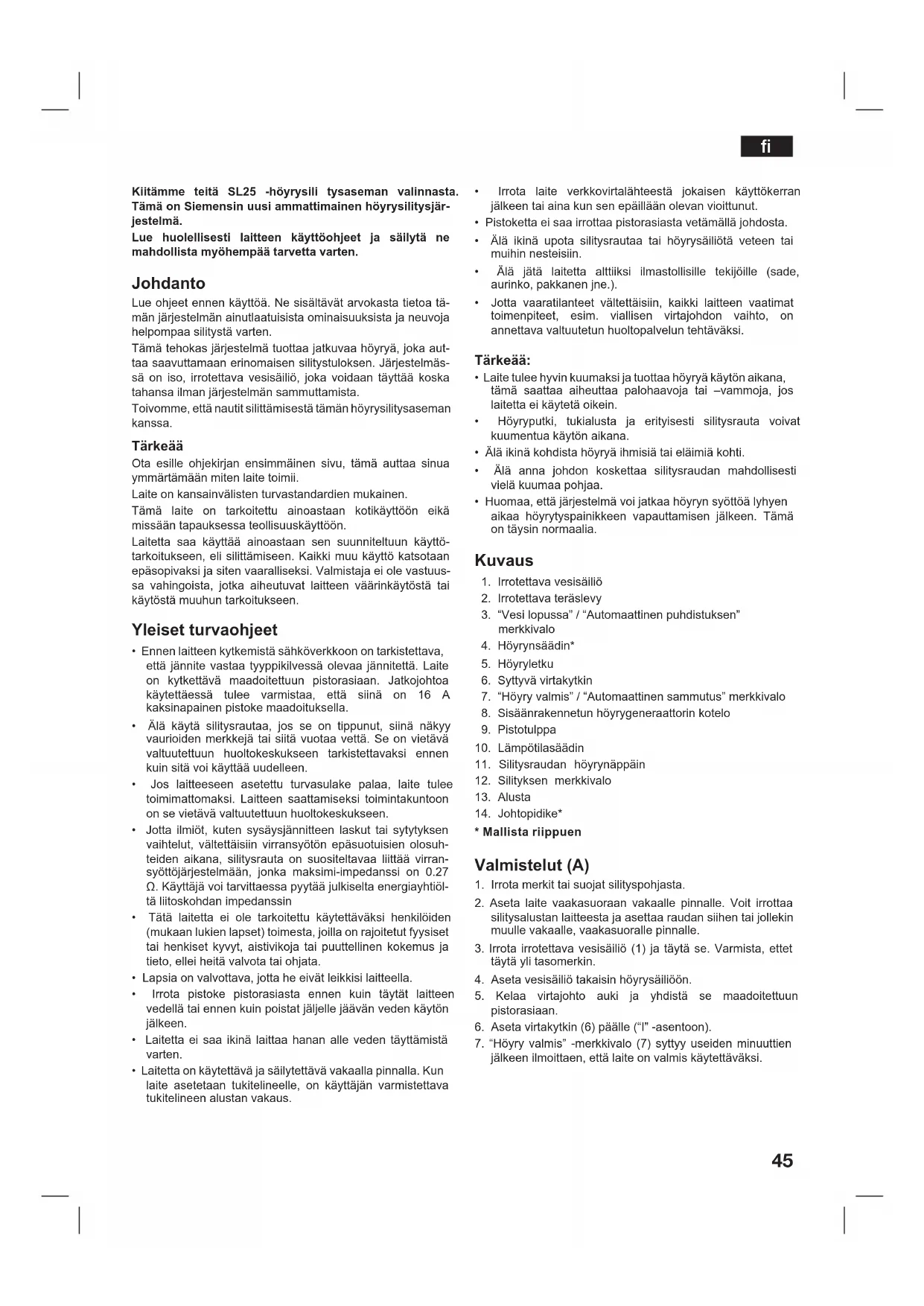 Kiitämme teitä SL25 -höyrysili tysaseman valinnasta. Tämä on Siemensin uusi ammattimainen höyrysilitysjär- jestelmä. Lue huolellisesti laitteen käyttöohjeet ja säilytä ne mahdollista myöhempää tarvetta varten. Johdanto Lue ohjeet ennen käyttöä. Ne sisältävät arvokasta tietoa tä- män järjestelmän ainutlaatuisista ominaisuuksista ja neuvoja helpompaa silitystä varten. Tämä tehokas järjestelmä tuottaa jatkuvaa höyryä, joka aut- taa saavuttamaan erinomaisen silitystuloksen. Järjestelmäs- sä on iso, irrotettava vesisäiliö, joka voidaan täyttää koska tahansa ilman järjestelmän sammuttamista. Toivomme, että nautit silittämisestä tämän höyrysilitysaseman kanssa. Tärkeää Ota esille ohjekirjan ensimmäinen sivu, tämä auttaa sinua ymmärtämään miten laite toimii. Laite on kansainvälisten turvastandardien mukainen. Tämä laite on tarkoitettu ainoastaan kotikäyttöön eikä missään tapauksessa teollisuuskäyttöön. Laitetta saa käyttää ainoastaan sen suunniteltuun käyttö- tarkoitukseen, eli silittämiseen. Kaikki muu käyttö katsotaan epäsopivaksi ja siten vaaralliseksi. Valmistaja ei ole vastuus- sa vahingoista, jotka aiheutuvat laitteen väärinkäytöstä tai käytöstä muuhun tarkoitukseen. Yleiset turvaohjeet