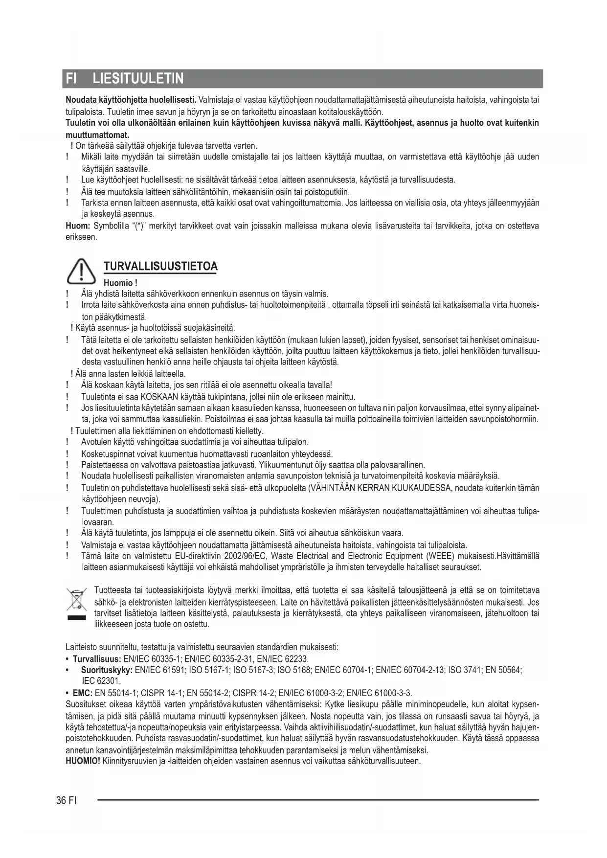 Õhupuhasti funktsioonide valimiseks piisab, kui käskluste nuppe kergelt puudutada. T1. Puhkerežiim / kuvar sisse T2. Tõmbekiiruse (-võimsuse) sisse- ja väljalülitamise nupp 1 T3. Tõmbekiiruse (-võimsuse) sisse- ja väljalülitamise nupp 2 T4. Tõmbekiiruse (-võimsuse) sisse- ja väljalülitamise nupp 3 T5. Tuled sisse/välja (ON/OFF) HOOLDUS Enne hooldustöid võtke õhupuhasti vooluvõrgust välja. Puhastamine Õhupuhastit tuleb sageli (vähemalt sama tihti, kui hooldatakse rasvaltreid) nii seest kui ka väljast puhastada. Puhastamiseks kasutage neutraalse vedela puhastusvahendiga niisutatud lappi. Vältige abrasiivseid aineid sisaldavaid vahendeid. ÄRGE KASUTAGE PUHASTAMISEKS ALKOHOLI! Tähelepanu! Seadme puhastamise ja ltrite vahetamise eeskirjade mittejärgimisega kaasneb tulekahju oht. Seepärast on soovitatav järgida antud juhiseid. Me ei võta endale mingit vastutust ebaõigest käsitsemisest või eespool toodud ettevaatusabinõude eiramisest tingitud võimalike mootori- kahjustuste ja tulekahjude eest. Rasvalter Püüab kinni toiduvalmistamisel tekkivad rasvaosakesed. Seda tuleb kord kuus mittesööbivate puhastusvahenditega puhastada kas käsitsi või nõudepesumasinas madala temperatuuri ja lühikese tsükliga. Nõudepesumasinas pesemisel võib metallist rasvalter värvi muuta, aga tema ltreerimisomadusi ei muuda see vähimalgi määral. Rasvaltri eemaldamiseks tõmmake hooba. Aktiivsöelter (ainult ltreeriva režiimi jaoks) Absorbeerib toiduvalmistamisel tekkivad ebameeldivad lõhnad. Söelter küllastub kas lühema või pikema kasutamise järel olenevalt pliidist ja sellest, kui korrapäraselt rasvaltrit puhastatakse. Igal juhul tuleb kassett välja vahetada vähemalt iga nelja kuu tagant. Seda EI TOHI pesta ega taasaktiveerida Ümmargunesöelter Asetage üks lter kummalegi küljele nii, et need kataks mootori tööratta mõlemad kaitsevõred, seejärel pöörake päripäeva. Nende mahavõtmiseks pöörake vastupäeva. Pirnide vahetamine Võtke aparaat vooluvõrgust välja. Tähelepanu! Enne pirnide puudutamist veenduge, kas need on jahtunud. Asendage katkine lamp sama tüüpi lambiga, nii nagu on kirjas märgisel või õhupuhastil lambi kõrval. Õhupuhasti on varustatud LED-valgustitega. LED-lambid tagavad optimaalse valguse kuni kümme korda pikema kestvusega võrreldes tavalampidega ning nende elektrienergia kok- kuhoid on 90%. Pirnide väljavahetamiseks pöörduge teeninduskeskuse poole. T1 T2 T3 T4 T536 FI FI LIESITUULETIN Noudata käyttöohjetta huolellisesti. Valmistaja ei vastaa käyttöohjeen noudattamattajättämisestä aiheutuneista haitoista, vahingoista tai tulipaloista. Tuuletin imee savun ja höyryn ja se on tarkoitettu ainoastaan kotitalouskäyttöön. Tuuletin voi olla ulkonäöltään erilainen kuin käyttöohjeen kuvissa näkyvä malli. Käyttöohjeet, asennus ja huolto ovat kuitenkin muuttumattomat. ! On tärkeää säilyttää ohjekirja tulevaa tarvetta varten. ! Mikäli laite myydään tai siirretään uudelle omistajalle tai jos laitteen käyttäjä muuttaa, on varmistettava että käyttöohje jää uuden käyttäjän saataville. ! Lue käyttöohjeet huolellisesti: ne sisältävät tärkeää tietoa laitteen asennuksesta, käytöstä ja turvallisuudesta. ! Älä tee muutoksia laitteen sähköliitäntöihin, mekaanisiin osiin tai poistoputkiin. ! Tarkista ennen laitteen asennusta, että kaikki osat ovat vahingoittumattomia. Jos laitteessa on viallisia osia, ota yhteys jälleenmyyjään ja keskeytä asennus. Huom: Symbolilla “(*)” merkityt tarvikkeet ovat vain joissakin malleissa mukana olevia lisävarusteita tai tarvikkeita, jotka on ostettava erikseen. TURVALLISUUSTIETOA Huomio ! ! Älä yhdistä laitetta sähköverkkoon ennenkuin asennus on täysin valmis. ! Irrota laite sähköverkosta aina ennen puhdistus- tai huoltotoimenpiteitä , ottamalla töpseli irti seinästä tai katkaisemalla virta huoneis- ton pääkytkimestä. ! Käytä asennus- ja huoltotöissä suojakäsineitä. ! Tätä laitetta ei ole tarkoitettu sellaisten henkilöiden käyttöön (mukaan lukien lapset), joiden fyysiset, sensoriset tai henkiset ominaisuu- det ovat heikentyneet eikä sellaisten henkilöiden käyttöön, joilta puuttuu laitteen käyttökokemus ja tieto, jollei henkilöiden turvallisuu- desta vastuullinen henkilö anna heille ohjausta tai ohjeita laitteen käytöstä. ! Älä anna lasten leikkiä laitteella. ! Älä koskaan käytä laitetta, jos sen ritilää ei ole asennettu oikealla tavalla! ! Tuuletinta ei saa KOSKAAN käyttää tukipintana, jollei niin ole erikseen mainittu. ! Jos liesituuletinta käytetään samaan aikaan kaasulieden kanssa, huoneeseen on tultava niin paljon korvausilmaa, ettei synny alipainet- ta, joka voi sammuttaa kaasuliekin. Poistoilmaa ei saa johtaa kaasulla tai muilla polttoaineilla toimivien laitteiden savunpoistohormiin. ! Tuulettimen alla liekittäminen on ehdottomasti kielletty. ! Avotulen käyttö vahingoittaa suodattimia ja voi aiheuttaa tulipalon. ! Kosketuspinnat voivat kuumentua huomattavasti ruoanlaiton yhteydessä. ! Paistettaessa on valvottava paistoastiaa jatkuvasti. Ylikuumentunut öljy saattaa olla palovaarallinen. ! Noudata huolellisesti paikallisten viranomaisten antamia savunpoiston teknisiä ja turvatoimenpiteitä koskevia määräyksiä. ! Tuuletin on puhdistettava huolellisesti sekä sisä- että ulkopuolelta (VÄHINTÄÄN KERRAN KUUKAUDESSA, noudata kuitenkin tämän käyttöohjeen neuvoja). ! Tuulettimen puhdistusta ja suodattimien vaihtoa ja puhdistusta koskevien määräysten noudattamattajättäminen voi aiheuttaa tulipa- lovaaran. ! Älä käytä tuuletinta, jos lamppuja ei ole asennettu oikein. Siitä voi aiheutua sähköiskun vaara. ! Valmistaja ei vastaa käyttöohjeen noudattamatta jättämisestä aiheutuneista haitoista, vahingoista tai tulipaloista. ! Tämä laite on valmistettu EU-direktiivin 2002/96/EC, Waste Electrical and Electronic Equipment (WEEE) mukaisesti.Hävittämällä laitteen asi