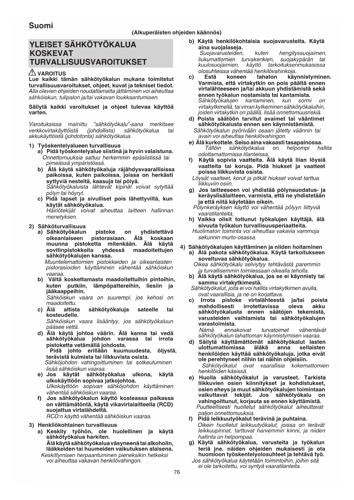 a) Sähkötyökalun pistoke on yhdistettävä oikeanlaiseen pistorasiaan. Älä koskaan muunna pistoketta mitenkään. Älä käytä sovitinpistokkeita yhdessä maadoitettujen sähkötyökalujen kanssa. Muuntelemattomien pistokkeiden ja oikeanlaisten pistorasioiden käyttäminen vähentää sähköiskun vaaraa. b) Vältä koskettamasta maadoitettuihin pintoihin, kuten putkiin, lämpöpattereihin, liesiin ja jääkaappeihin. Sähköiskun vaara on suurempi, jos kehosi on maadoitettu. c) Älä altista sähkötyökaluja sateelle tai kosteudelle. Sähköiskun vaara lisääntyy, jos sähkötyökaluun pääsee vettä. d) Älä käytä johtoa väärin. Älä kanna tai vedä sähkötyökalua johdon varassa tai irrota pistoketta vetämällä johdosta. Pidä johto erillään kuumuudesta, öljystä, terävistä kulmista tai liikkuvista osista. Sähköjohdon vahingoittuminen tai sotkeutuminen lisää sähköiskun vaaraa. e) Jos käytät sähkötyökalua ulkona, käytä ulkokäyttöön sopivaa jatkojohtoa. Ulkokäyttöön sopivan sähköjohdon käyttäminen vähentää sähköiskun vaaraa. f) Jos sähkötyökalun käyttö kosteassa paikassa on välttämätöntä, käytä vikavirtalaitteella (RCD) suojattua virtalähdettä. RCD:n käyttö vähentää sähköiskun vaaraa.