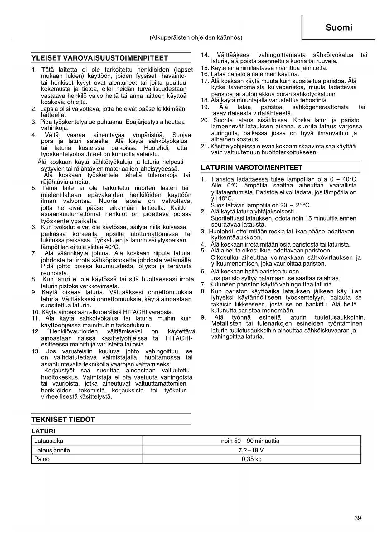 Metallisten tai tulenarkojen esineiden työntäminen laturin tuuletusaukkoihin aiheuttaa sähköiskuvaaran ja vahingoittaa laturia. (Alkuperäisten ohjeiden käännös) TEKNISET TIEDOT LATURI Latausaika noin 50 – 90 minuuttia Latausjännite 7,2 – 18 V Paino 0,35 kg 000BookUC18YKWE+NE.indb39000BookUC18YKWE+NE.indb39 2010/02/0118:15:322010/02/0118:15:3240 Suomi KÄYTTÖ HITACHI pariston lataukseen. ○ EB712S, EB7S, EB714S, FEB7S, EB7B, BCC912, EB912S, EB9S, EB914S, EB914, FEB9S, EB9B, EB924, BCC1212, EB1212S, EB12S, EB1214S, EB1214L, FEB12S, EB12B, EB1220BL, EB1224, BCC1412, EB1412S, EB1414S, EB1414, EB14B, EB1424, EB1812S, BCC1812, EB1814SL, EB18B, EB1820, EB1820L, EB1824L LATAUS Ennen poran käyttöä lataa paristo seuraavien ohjeiden mukaisesti.