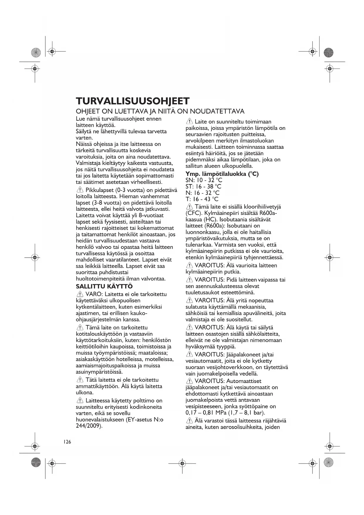 VARO: Laitetta ei ole tarkoitettu käytettäväksi ulkopuolisen kytkentälaitteen, kuten esimerkiksi ajastimen, tai erillisen kauko- ohjausjärjestelmän kanssa. Tämä laite on tarkoitettu kotitalouskäyttöö n ja vastaaviin käyttötarkoituksiin, kuten: henkilöstön keittiötiloihin kaupoissa, toimistoissa ja muissa työympäristöissä; maataloissa; asiakaskäyttöön hotelleissa, motelleissa, aamiaismajoituspaikoissa ja muissa asuinympäristöissä. Tätä laitetta ei ole tarkoitettu ammattikäyttöön. Älä käytä laitetta ulkona. Laitteessa käytetty polttimo on suunniteltu erityisesti kodinkoneita varten, eikä se sovellu huonevala istukseen (EY-asetus N:o 244/2009). Laite on suunniteltu toimimaan paikoissa, joissa ympäristön lämpötila on seuraavien rajoitusten puitteissa, arvokilpeen merkityn ilmastoluokan mukaisesti. Laitteen toiminnassa saattaa esiintyä häiriöitä, jos se jätetään pidemmäksi aikaa lämpötilaan, joka on sallitun alueen ulkopuolella. Ymp. lämpötilaluokka (°C) SN: 10 - 32 °C ST: 16 - 38 °C N: 16 - 32 °C T: 16 - 43 °C Tämä laite ei sisällä kloorihiilivetyjä (CFC). Kylmäainepiiri sisältää R600a- kaasua (HC). Isobutaania sisältävät laitteet (R600a): Isobutaani on luonnonkaasu, jolla ei ole haitallisia ympäristövaikutuksia, mutta se on tulenarkaa. Varmista sen vuoksi, että kylmäainepiirin putkissa ei ole vaurioita, etenkin kylmäainepiiriä tyhjennettäessä. VAROITUS: Älä vaurioita laitteen kylmäainepiirin putkia. VAROITUS: Pidä laitteen vaipassa tai sen asennuskalusteessa olevat tuuletusaukot esteettöminä. VAROITUS: Älä yritä nopeuttaa sulatusta käyttämällä mekaanisia, sähköisiä tai kemiallisia apuvälineitä, joita valmistaja ei ole suositellut. VAROITUS: Älä käytä tai säilytä laitteen osastojen sisällä sähkölaitteita, elleivät ne ole valmistajan nimenomaan hyväksymää tyyppiä. VAROITUS: Jääpalakoneet ja/tai vesiautomaatit, joita ei ole kytket