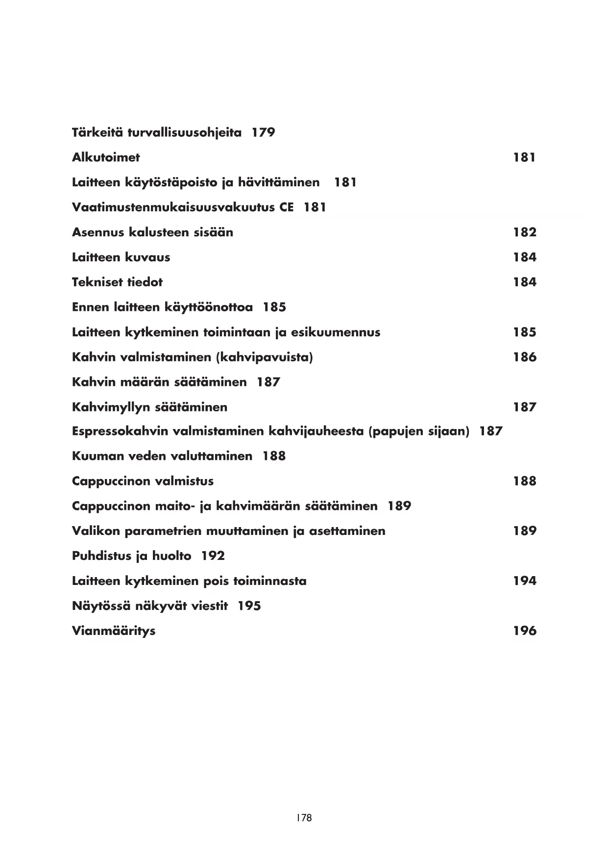 Kahvi ei ole kuumaa. - Kuppeja ei ole esilämmitetty. - Suodatin on jäähtynyt, koska viimeisen kahvin valmistuksesta on 2-3 minuuttia. - Asetettu lämpötila ei ole riittävän korkea. - Lämmitä kupit huuhtelemalla ne kuumalla vedellä. - Kuumenna suodatin ennen kahvin valmistusta valitsemalla valikon toiminto HUUHTELU. - Muuta asetettua lämpötilaa (katso kappale Kahvin lämpötilan säätäminen). Kahvissa on vähän kreemaa. - Kahvi on jauhettu liian karkeaksi. - Kahvilaatu ei ole sopiva. - Kierrä jauhatuksen säädintä vastapäivään yksi pykälä kohti numeroa 1 kahvimyllyn toiminnan aikana (kuva 14). - Käytä espressokahville tarkoitettua kahvilaatua. Kahvi valuu liian hitaasti tai tipoittain. - Kahvi on jauhettu liian hienoksi. - Kierrä jauhatuksen säädintä myötäpäivään yksi pykälä kohti numeroa 7 kahvimyllyn toiminnan aikana (kuva 14). Kierrä säädintä pykälä kerrallaan, kunnes kahvin valumisnopeus on sopiva. Vaikutus näkyy vasta kahden kahvin valmistuksen jälkeen. Kahvi valuu liian nopeasti. - Kahvi on jauhettu liian karkeaksi. - Kierrä jauhatuksen säädintä vastapäivään yksi pykälä kohti numeroa 1 kahvimyllyn toiminnan aikana (kuva 14). Varo kiertämästä jauhatuksen säädintä liikaa. Muussa tapauksessa kahvi voi valua tipoittain kahden kahvin valmistuksen yhteydessä. Vaikutus näkyy vasta kahden kahvin valmistuksen jälkeen. Kahvia ei tule toisesta tai ei kummastakaan suuttimesta. - Suuttimet ovat tukossa. - Puhdista suuttimet hammastikulla (kuva 26). Kahvia ei tule suuttimista, vaan sitä valuu huoltoluukkua (A2) pitkin. - Suuttimien reiät ovat kuivan kahvijauheen tukkimat. - Huoltoluukun sisällä oleva kahvin syöttölaite (A3) on tukossa. - Puhdista suuttimet hammastikulla, pesusienellä tai kovaharjaksisella harjalla (kuvat 26-28). - Puhdista kahvin syöttölaite (A3) huolellisesti, erityisesti saranoiden vierestä. Suuttimesta ei tule kahvia vaan vettä. - Kahvijauhe on juuttunut suppiloon (A21) - Puhdista suppilo (A21) puu- tai muovihaarukalla ja puhdista laitteen sisäpuoli. Suutinputkesta (C5) ei tule maitoa. - Maidonottoputki ei ole paikallaan, tai se on laitettu väärin paikalleen. - Työnnä maidonottoputki (C4) kunnolla maitosäiliön kannessa olevaan kumiholkkiin (kuva 23). Maito vaahtoutuu vain vähän. - Maitosäilön kansi on likainen. - Maitosäiliön säädin on väärässä kohdassa. - Puhdista maitosäiliön kansi noudattaen kappaleen Maitosäiliön puhdistaminen ohjeita. - Säädä säätimen asento noudattaen kappaleen CAPPUCCINON VALMISTUS ohjeita. Maidossa on isoja kuplia, tai sitä tulee roiskuen maitosuuttimesta. - Maito ei ole tarpeeksi kylmää, tai se on liian rasvaista. - Maidonvaahdottimen säädin on väärin säädetty. - Maitosäilön kansi on likainen. - Käytä mieluiten täysin rasvatonta maitoa tai vähärasvaista maitoa jääkaappikylmänä (noin 5 °C). Jos lopputulos ei ole vieläkään haluttu, kokeile jotain toista maitomerkkiä. - Siirrä säädintä vähän kohti tekstiä CAFFELATTE (katso kappale CAPPUCCINON VALMISTUS). - Puhdista maitosäiliön kansi noudattaen kappaleen Maitosäiliön puhdistaminen ohjeita.Instruções de segurança importantes 198 Primeiros passos 200 Desmantelar 200 Declaração de conformidade CE 200 Instalação de encastrar 201 Descrição do produto 203 Especificações técnicas 203 Utilizar o aparelho pela primeira vez 204 Ligar e pré-aquecer 204 Fazer café (com café em grão) 205 Alterar a quantidade de café na chávena 206 Ajustar o moinho de café 206 Fazer um expresso com café pré-moído (em vez de grãos) 206 Deixar sair água quente 207 Fazer cappuccino 207 Alterar a quantidade de leite e café para cappuccino 208 Alterar e definir os parâmetros de menu 208 Limpeza e manutenção 211 Desligar o aparelho 213 Mensagens exibidas 214 Resolução de problemas 215Instruções de segurança importantes